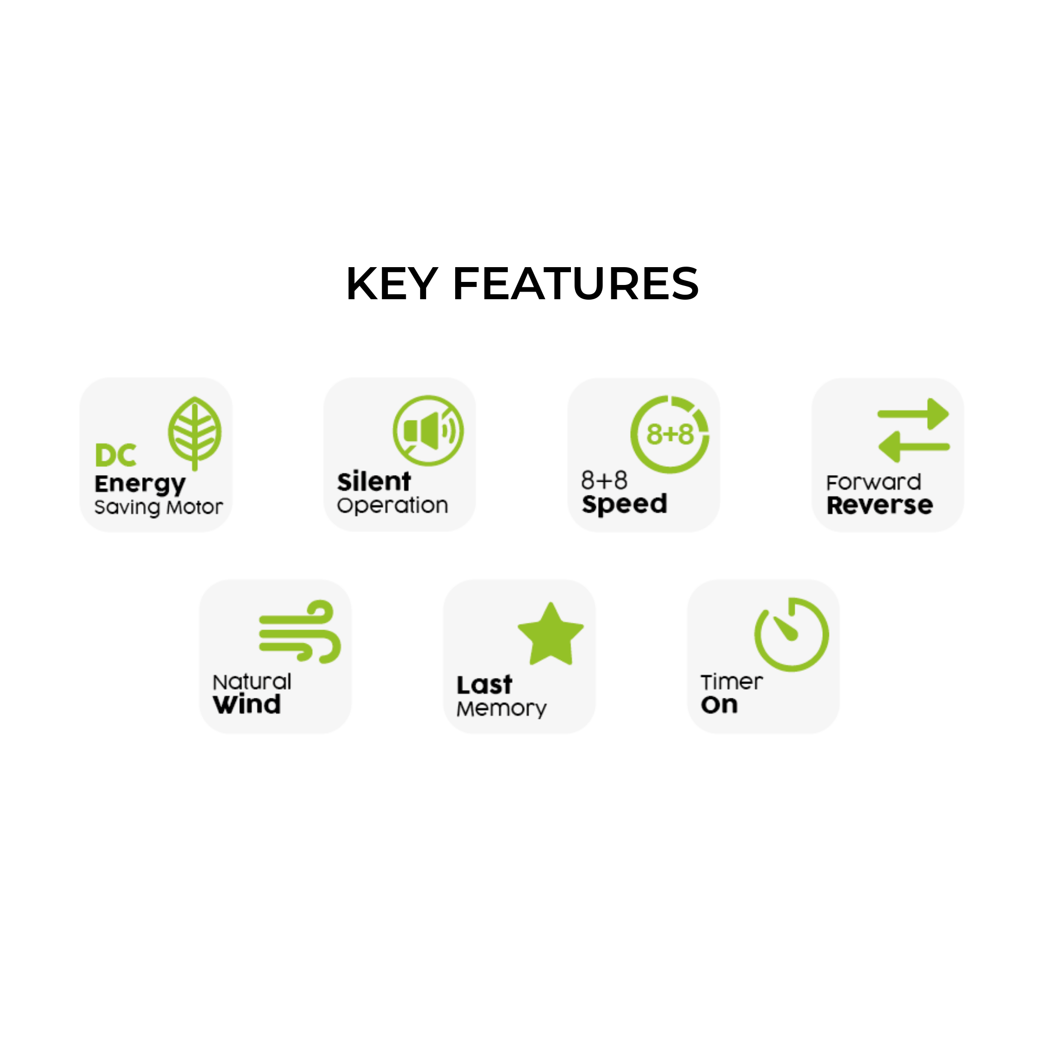 Model: IRIZ Series - Blade Span: 56" - Number of Blades: 5 - Blade Material: ABS - Motor Type: DC Motor - Speed Settings: 12 Speed (Forward/Reverse) - Control: RF Remote Control - Lighting: LED (3 Colour: Warm, Daylight, White) - *For LED Models only* - Available Colours: MATT BLACK, MATT WHITE, WALNUT/MB Warranty: - 10 Years Warranty on Motor - 2 Years Warranty on Internal Parts - 1 Year Warranty on On-Site Service