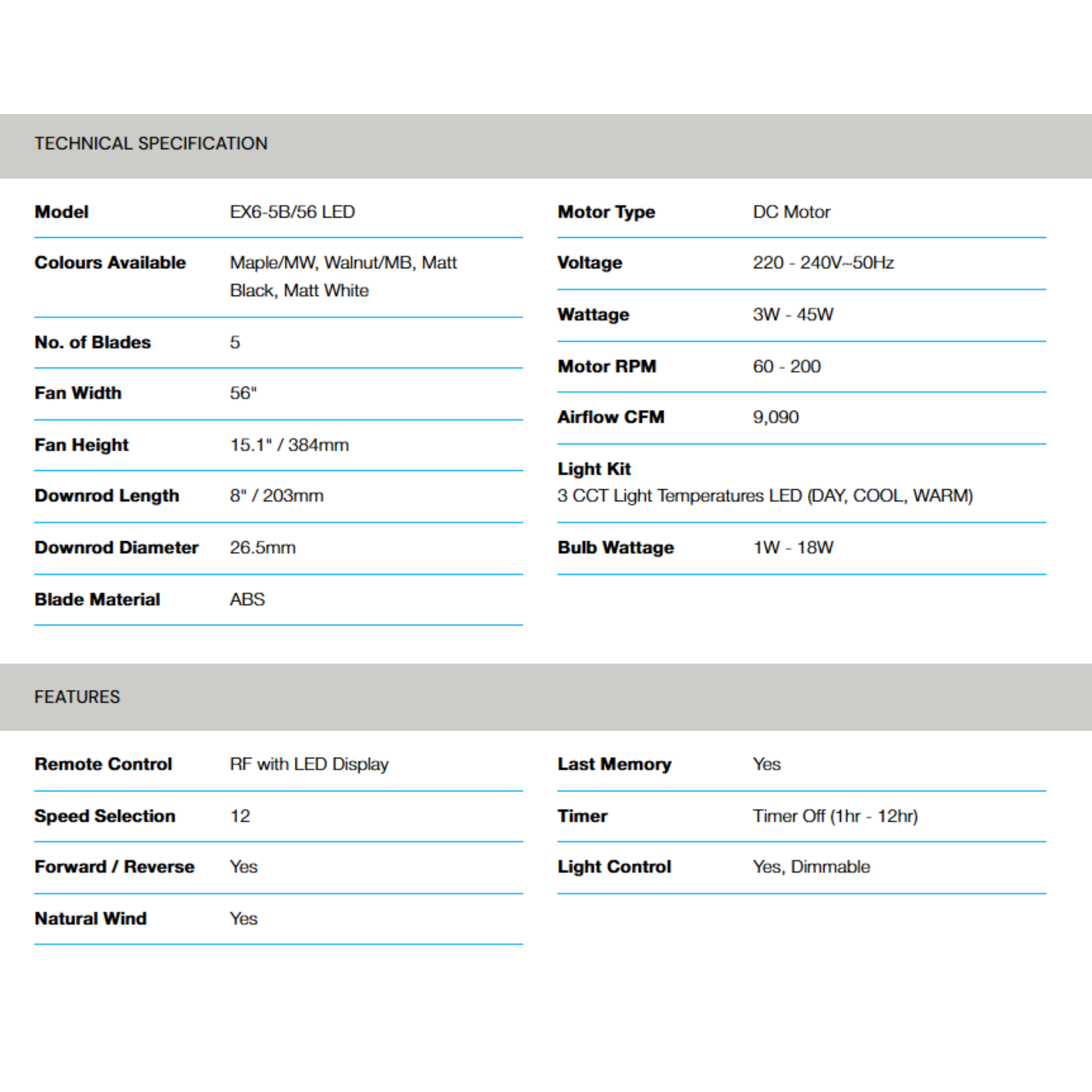 Buy Alpha EX6-5B 56" LED Fan with remote control. Features AC motor & 5 ABS blades. Original 1 Year Warranty & best price. Shop now.