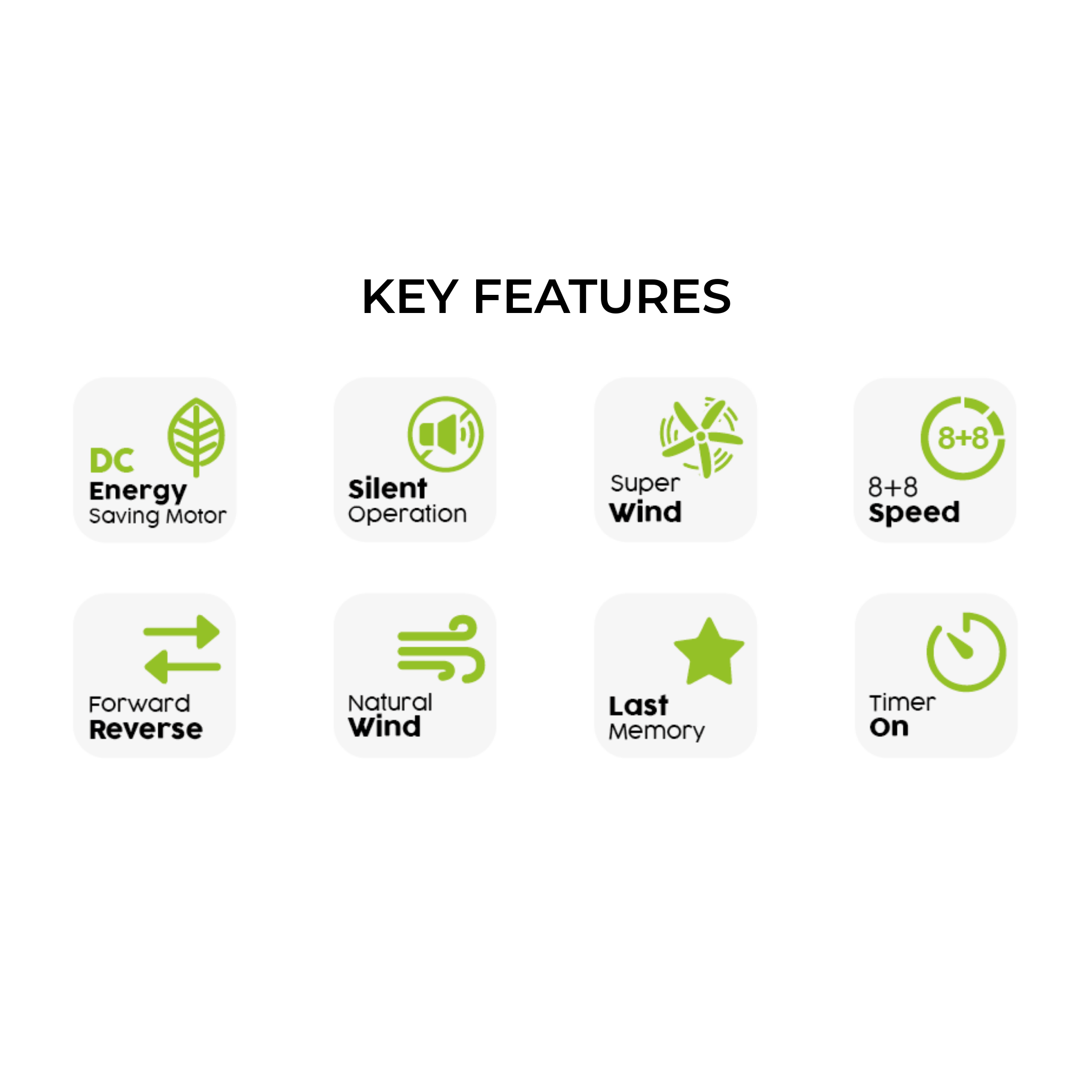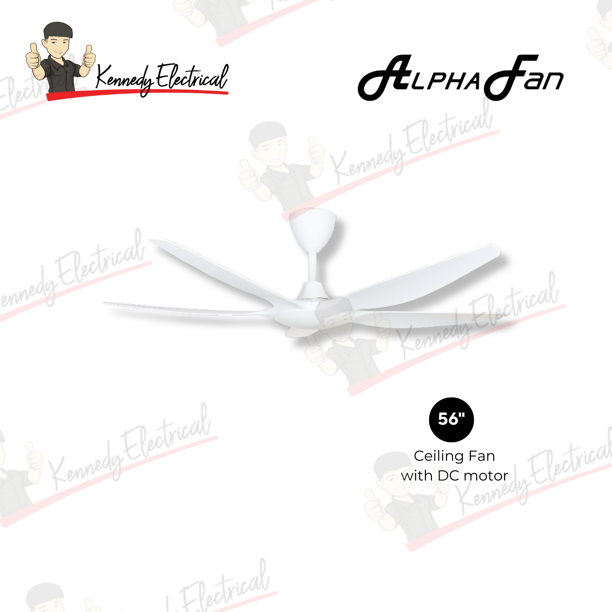 • Model: AX60-5B/56 • Series: AX60 • Motor Type: DC Motor • Features: Energy Saving, Silent Operation, High Torque • Blade Span: 56 inches • Number of Blades: 5 • Light Kit: No LED • Control: Remote Control Included • Material: Premium Quality ABS Blades (rust-free) • Warranty Information: - 1 Year Internal Parts - 10 Years DC Motor Warranty - 1 Year LED Light Kit (if applicable) - 1 Year Receiver