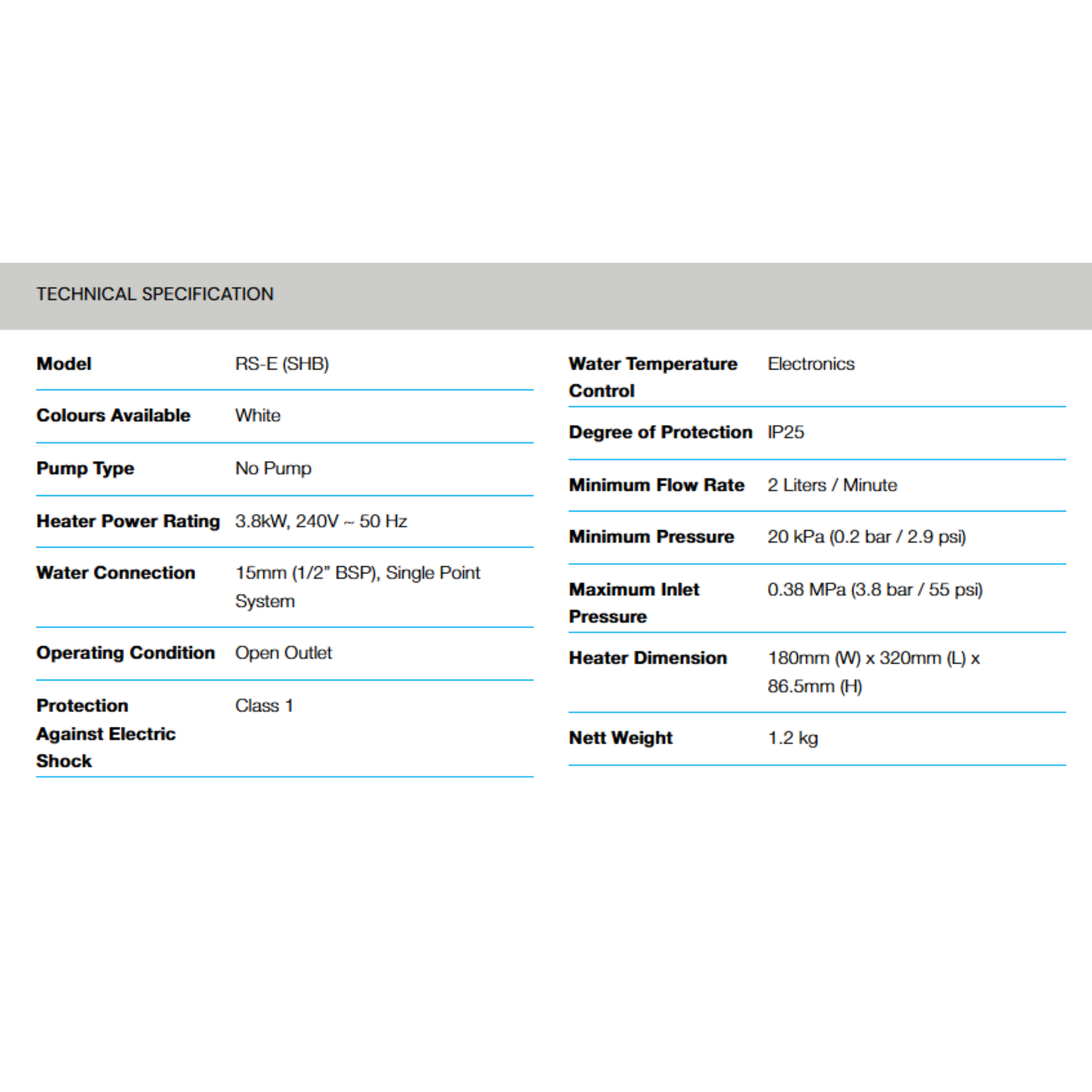 Model: RS-E (SHB)Type: Shower Bracket Set (Non-Pump)Colour: SK WhiteSuitable for Alpha Instant Water Heaters.