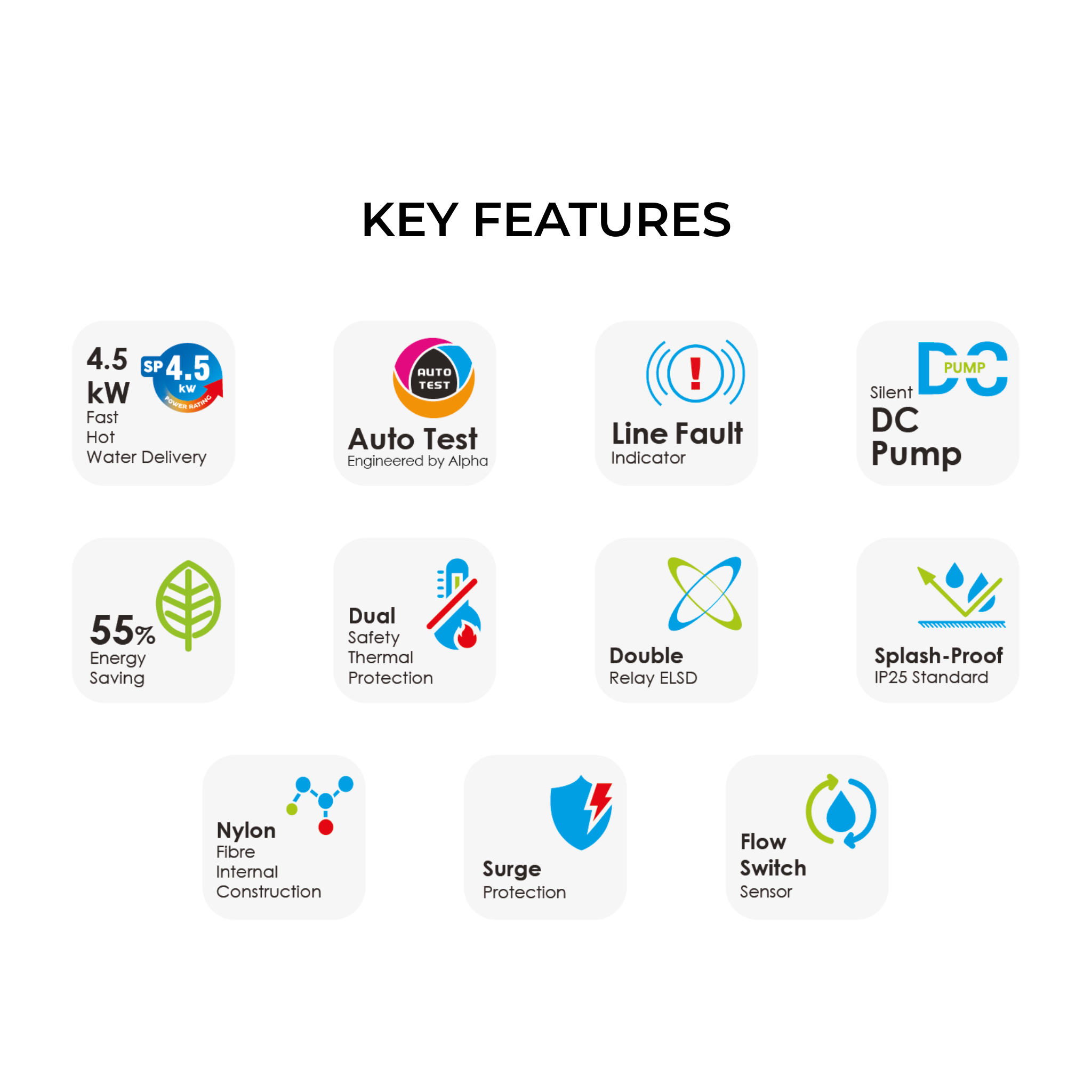 Model: SMART Series Type: Instant Water Heater with Rainshower (Select Models) Available Models: - SMART 18i (DC Pump) - SMART 18E (AC Pump) - SMART REVO-i (DC Pump, Smart Control) Features: - Rainshower accessories included (for Rainshower models) - Built-in Pump (DC for 'i' models, AC for 'E' models typically, please check specific model) - Safety Thermal Cut-out - Splash Proof IP25 Warranty: 5 Years Warranty on Heating Element 1 Year Warranty on Internal Parts (Alpha Standard)