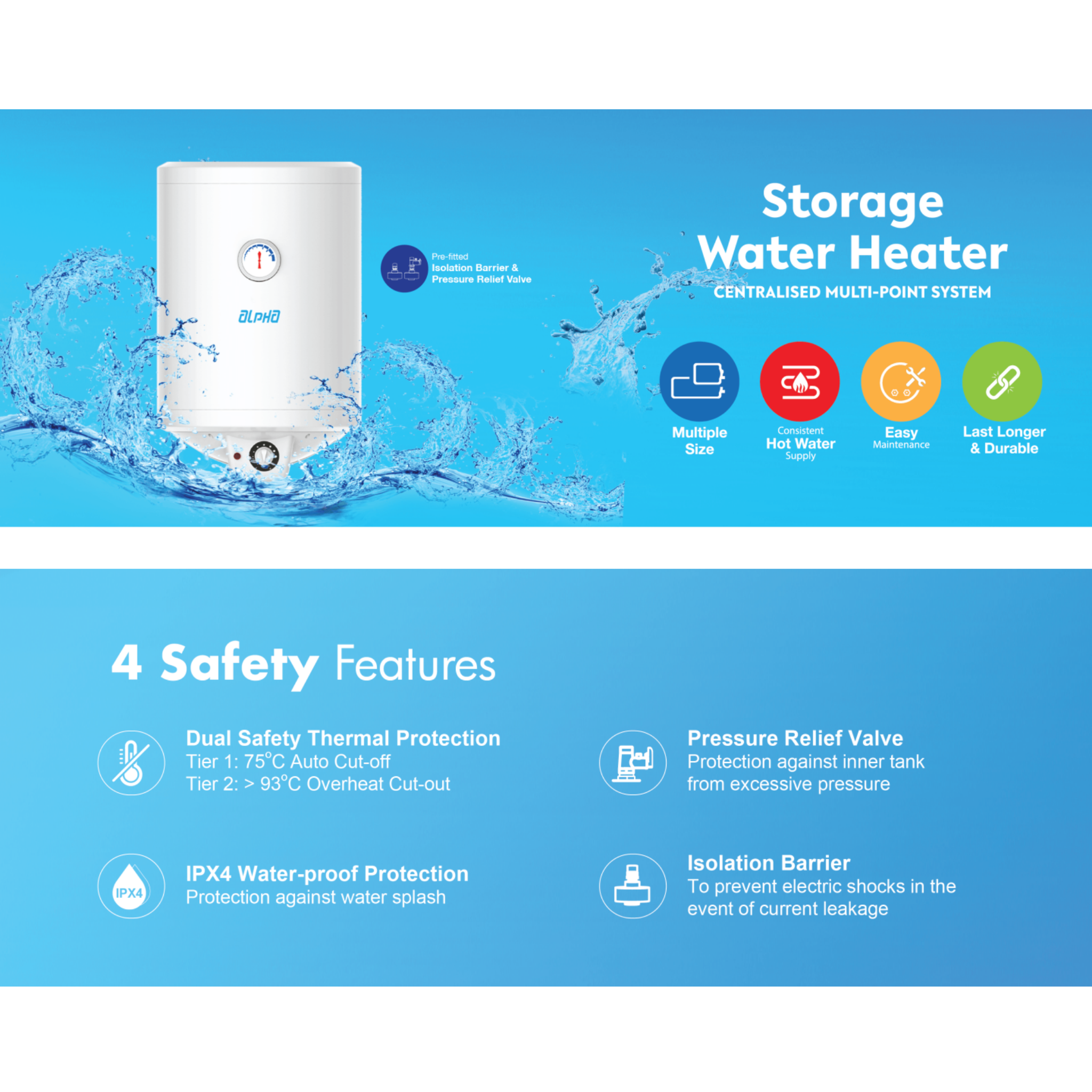 Model: AST Series Storage Water Heater Type: Centralised Multi-Point System Capacity Options: 30 Litres, 50 Litres Installation: Vertical (V) Features: - Centralised multi-point system - High-efficiency heating element - Safety thermal cut-out Warranty: 5 Years Warranty on Tank Leakage 1 Year Warranty on Internal Parts (Alpha Standard)