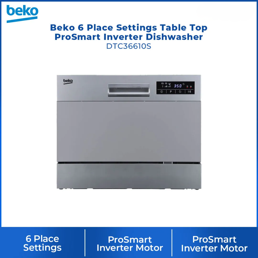 Features: • 6 Place Settings Compact Tabletop design. • HygieneIntense program. • ProSmart™ Inverter Motor. • 6 Washing Programs. • Silver finish. • Warranty: 2 Years General Warranty, 12 Years Motor Warranty. • **Warranty:** 2 Years