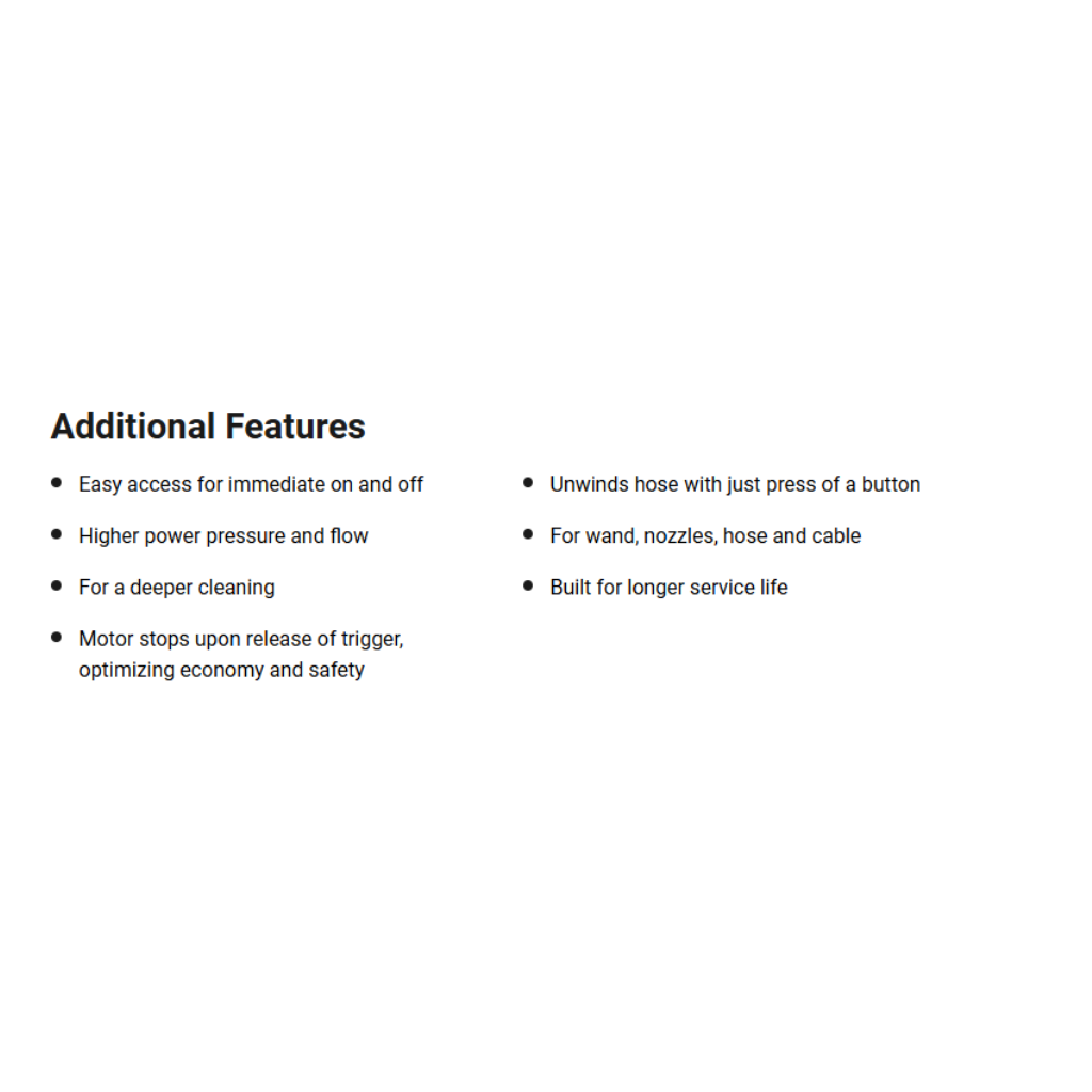 • 110 Bar Max Pressure. • 1300W Motor Power. • 6.6L/min Max Flow Rate. • Auto Stop System when trigger is released. • 3m Hose length. • **Warranty: 1 Year General Warranty.**