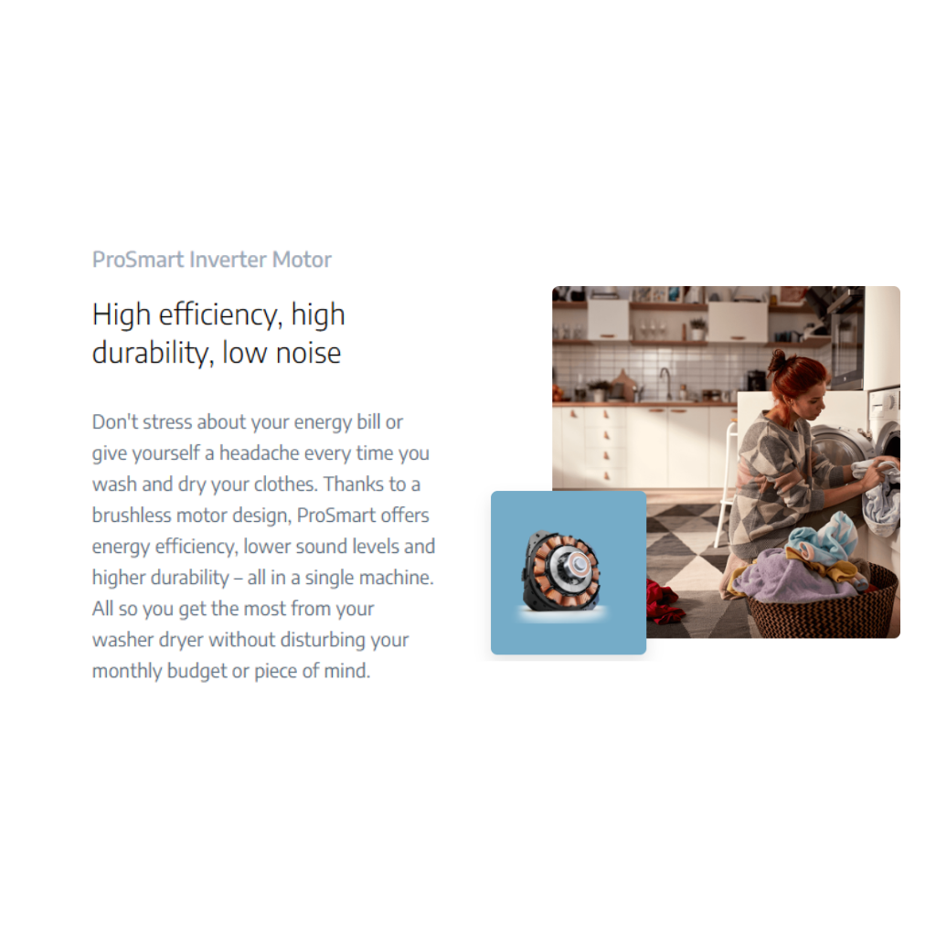 • 15 Program • HomeWhiz • Prosmart Inverter Motor • Aquawave • Prewash • Fast+ Funtion • Drumclean+ • Steamcure • Anticrease+ • Gentle Care • **Warranty: 2 Years General, 12 Years Motor.**