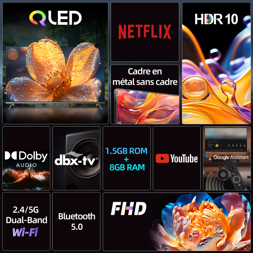 • Stunning 32-inch QLED Panel delivers vivid colors and high brightness. • Smart experience powered by Google TV with built-in Google Assistant. • Supports HDR10 decoding for enhanced contrast and details. • Immersive sound quality provided by Dolby Audio. • Ultra-modern Metal Frameless Bezel design. • **Warranty:** 2 years warranty for General Parts and Labour.