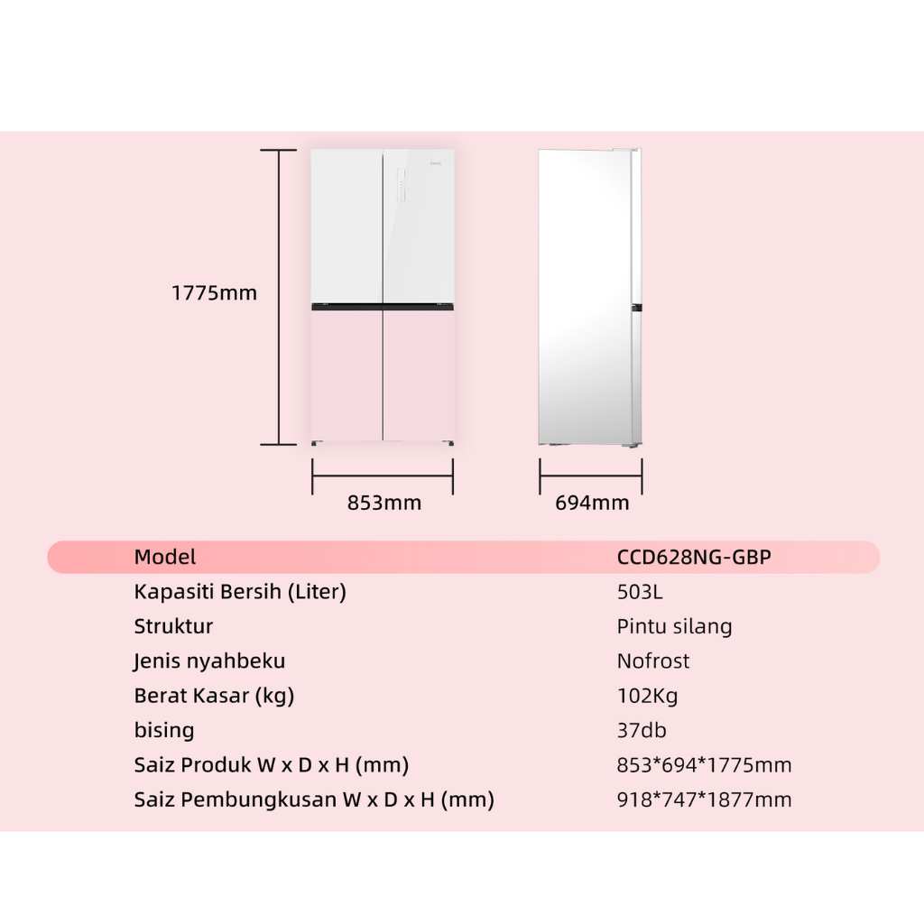• Capacity (Net/Gross): 503L / 628L. • Cooling: Dual Circulation Air Cooling System and Total No Frost. • Design: 4-Door Cross French Door design with Luxurious Glass Texture (GWH - White) / (GBP - Blue Purple / Pink). • Compressor: High-Efficiency Smart Inverter. • Performance: Quiet Operation (as low as 37dB). • Voltage: Wide Voltage Operation (196-244V) for stability. • **Warranty:** 10 Years Warranty on Compressor, 2 years General Warranty.