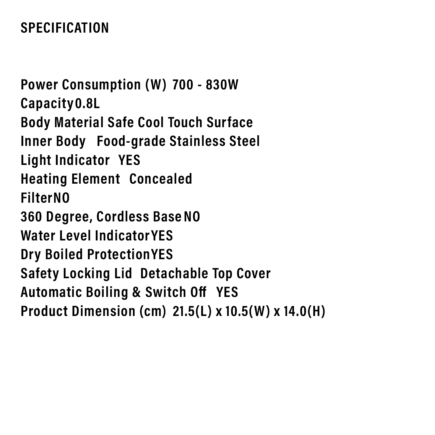 • Capacity: 0.8L • Type: Travel Kettle • Features: Stainless Steel Body, Dry Boil Protection, Compact • Color: Green • Warranty: 1 Year General Warranty