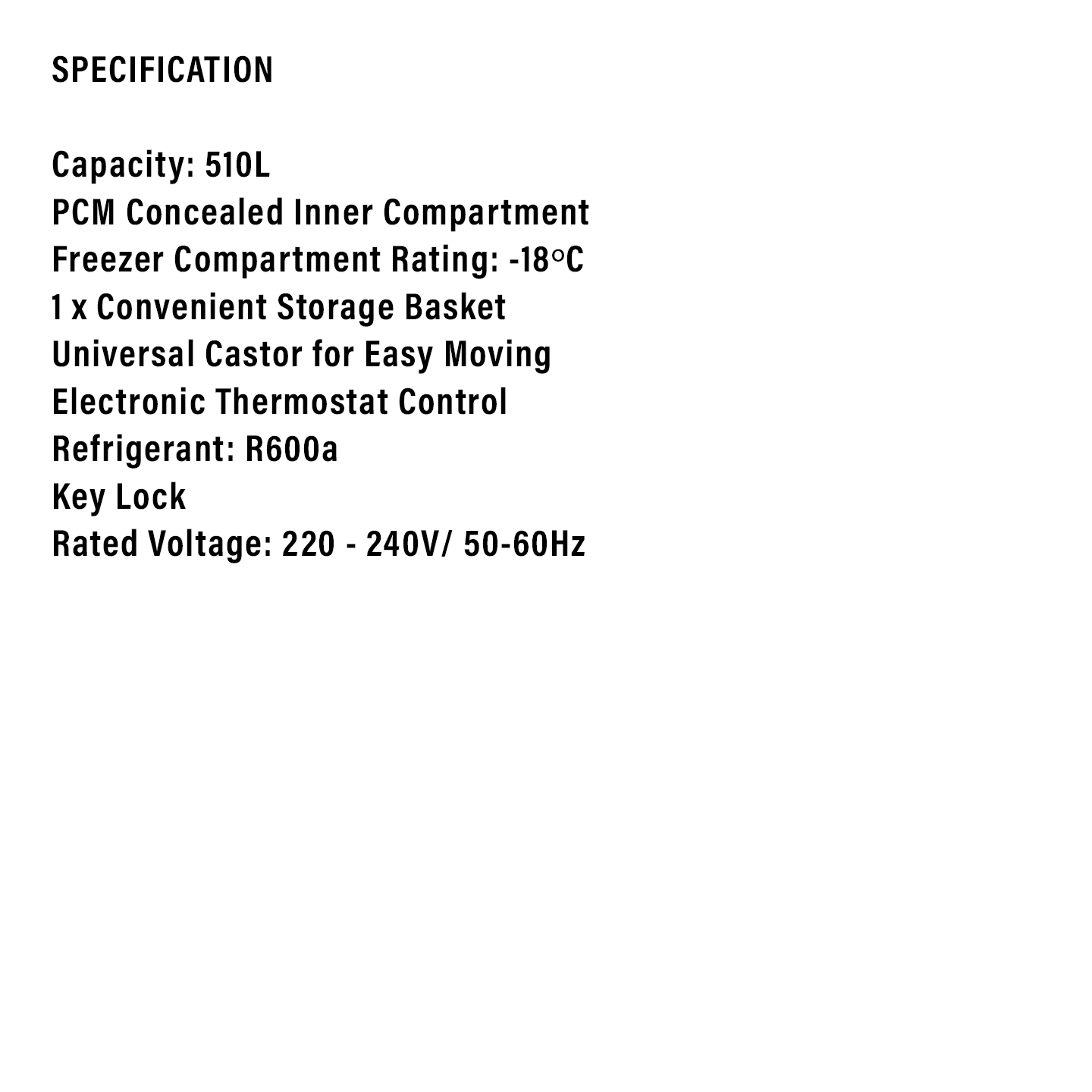 • Capacity: 510L (Gross) • Type: Artico Series Chest Freezer • Features: Digital Touch Control, Fast Freezing, LED Light, Key Lock • Color: Grey • Warranty: 1 Year General + 5 Years Compressor Warranty