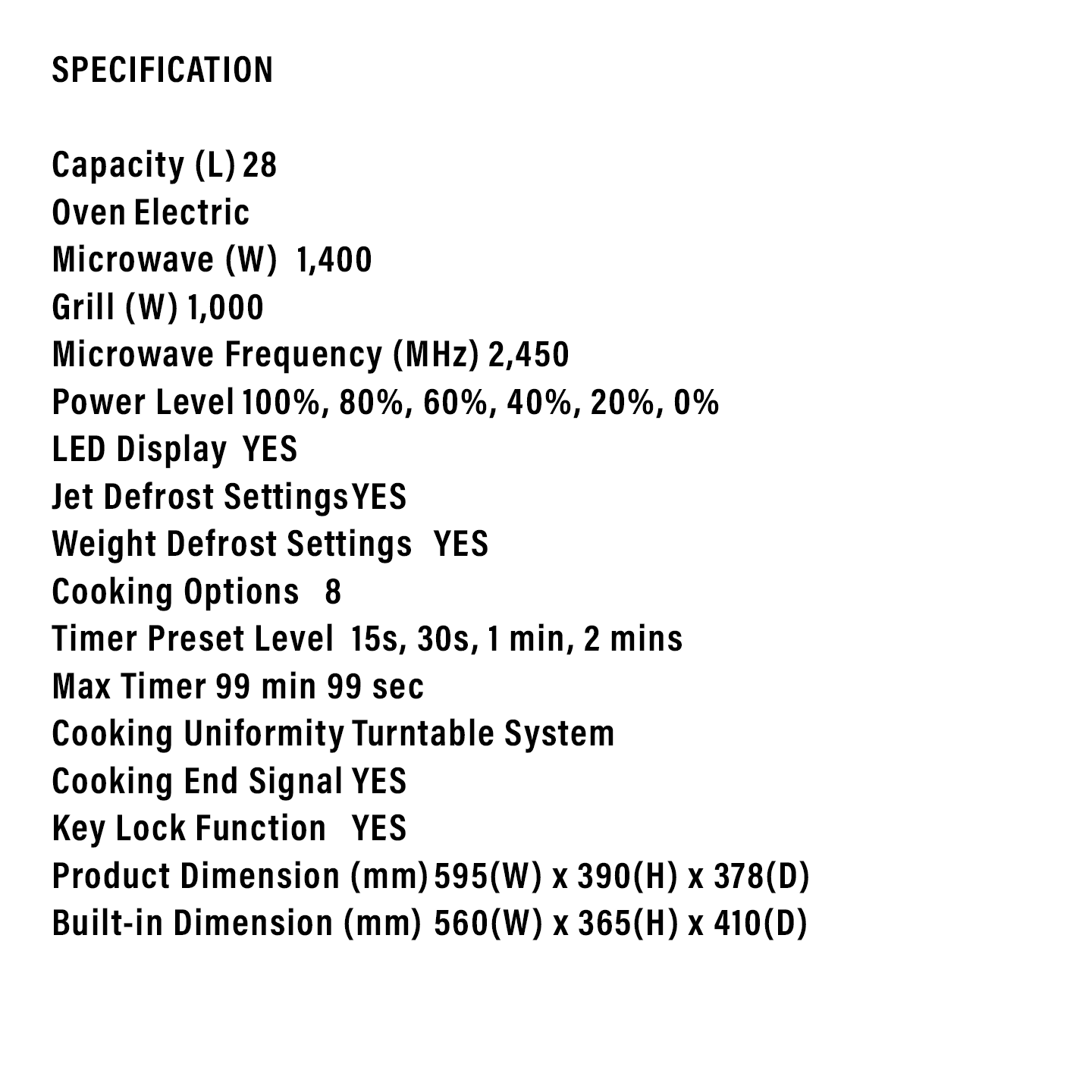 • Capacity: 25L (Check Spec for 75L - likely 25-28L for Microwave) • Type: Built-in Microwave Oven (Model suggests 28L/BI) • Features: Digital Display, Grill Function, Child Lock • Color: Black • Warranty: 1 Year General Warranty