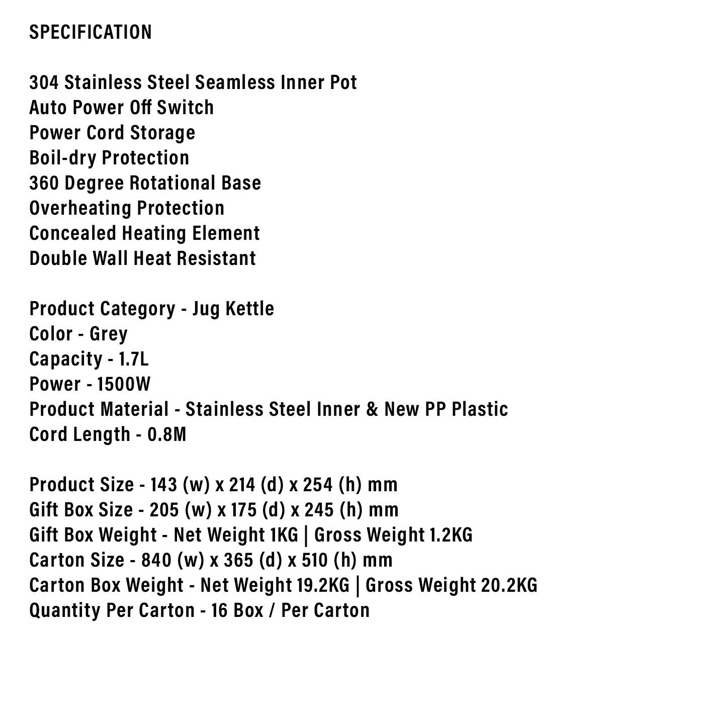 Faber 1.7L Jug Kettle FCK DW 1778GR