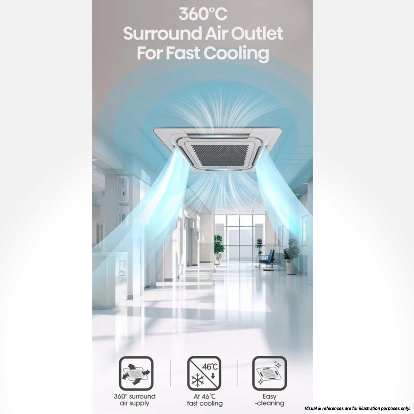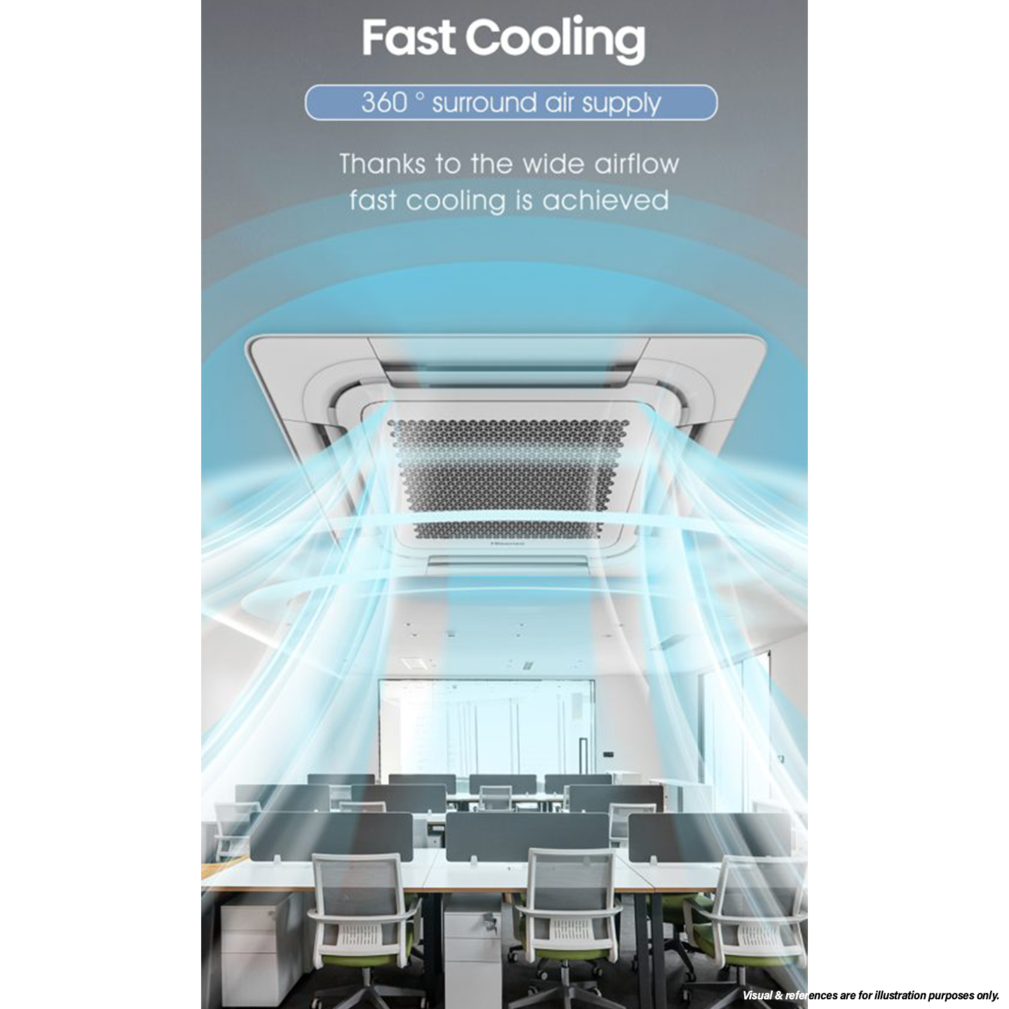 • Capacity: 2.5 HP / ~24,000 BTU/h • Type: R32 Ceiling Cassette (Indoor Unit) • Features: 4-Way Airflow, 360° Surround Cooling, Built-in Drain Pump • Warranty: 2 Years General + 7 Years Compressor Warranty