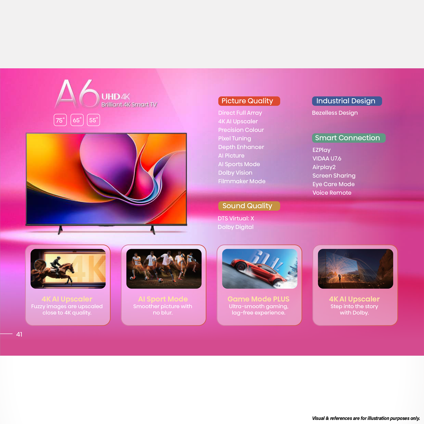 • Size/Screen: 55" 4K UHD LED • Features: A6Q Series, VIDAA Smart OS, Anyview Cast, Dolby Digital, Precision Colour • Resolution: 3840 x 2160 (4K UHD) • Warranty: 3 Years General Warranty