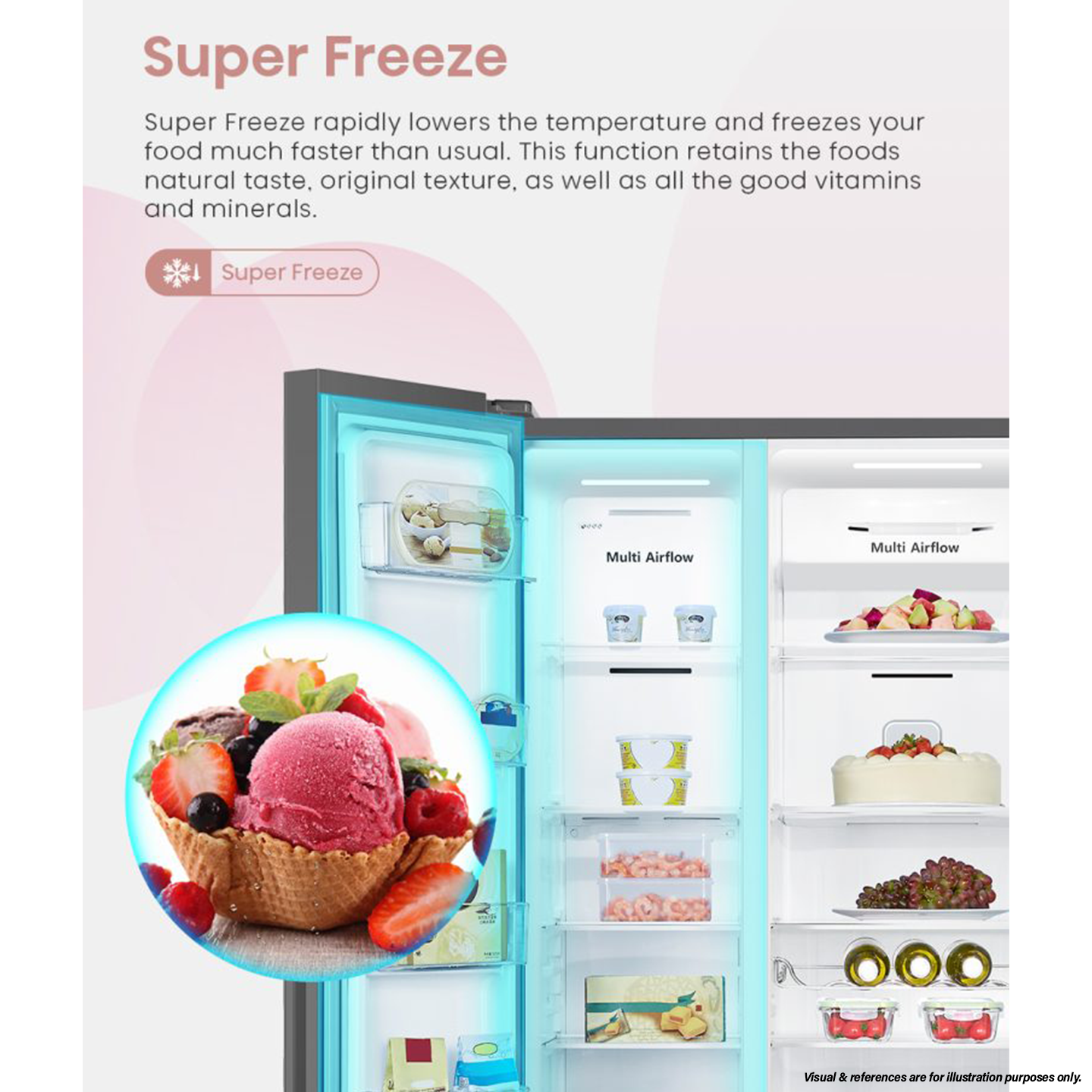 • Capacity: 620 Liters • Type: Side-by-Side Inverter Refrigerator • Features: Total No Frost, Durable Inverter, LED Lighting, Smart Electronic Control, PU Finish • Warranty: 2 Years General + 12 Years Compressor Warranty