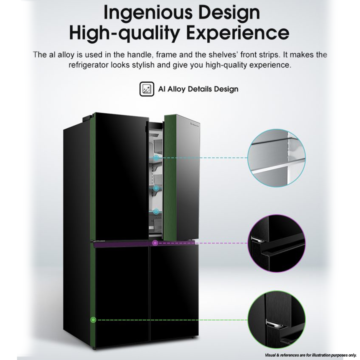 • Capacity: 720 Liters • Type: 4-Door Inverter Refrigerator • Features: Huge Capacity, Triple Temperature Zone, Vacuum Insulation Panel (VIP), Black Glass • Warranty: 2 Years General + 12 Years Compressor Warranty