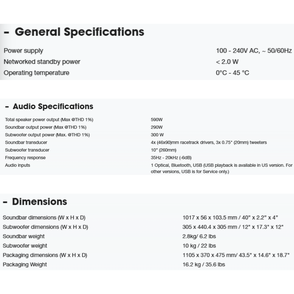 • 590W Total Output Power (Gen 1). • MultiBeam™ Technology and Dolby Atmos for 3D surround sound. • 10-inch Wireless Subwoofer for precise, punchy bass. • PureVoice Dialogue Enhancement technology. • Works with JBL One App for EQ customization. • **Warranty: 1 Year General Warranty.**