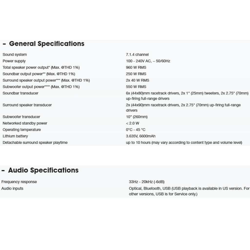 • 960W Total Output Power (MK2 Edition). • 7.1.4 Channel Real Surround Sound with Detachable Rear Speakers. • True Dolby Atmos, DTS:X, and MultiBeam Surround. • 10-inch Wireless Subwoofer for thunderous bass. • PureVoice technology ensures clear dialogue. • **Warranty: 1 Year General Warranty.**