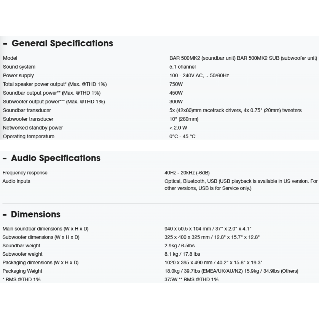 • 750W Total Output Power (MK2 Edition). • 5.1 Channel system with MultiBeam™ and Dolby Atmos. • 10-inch Wireless Subwoofer for deep bass. • PureVoice Dialogue Enhancement. • HDMI eARC with 4K Dolby Vision pass-through. • **Warranty: 1 Year General Warranty.**