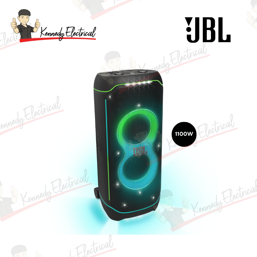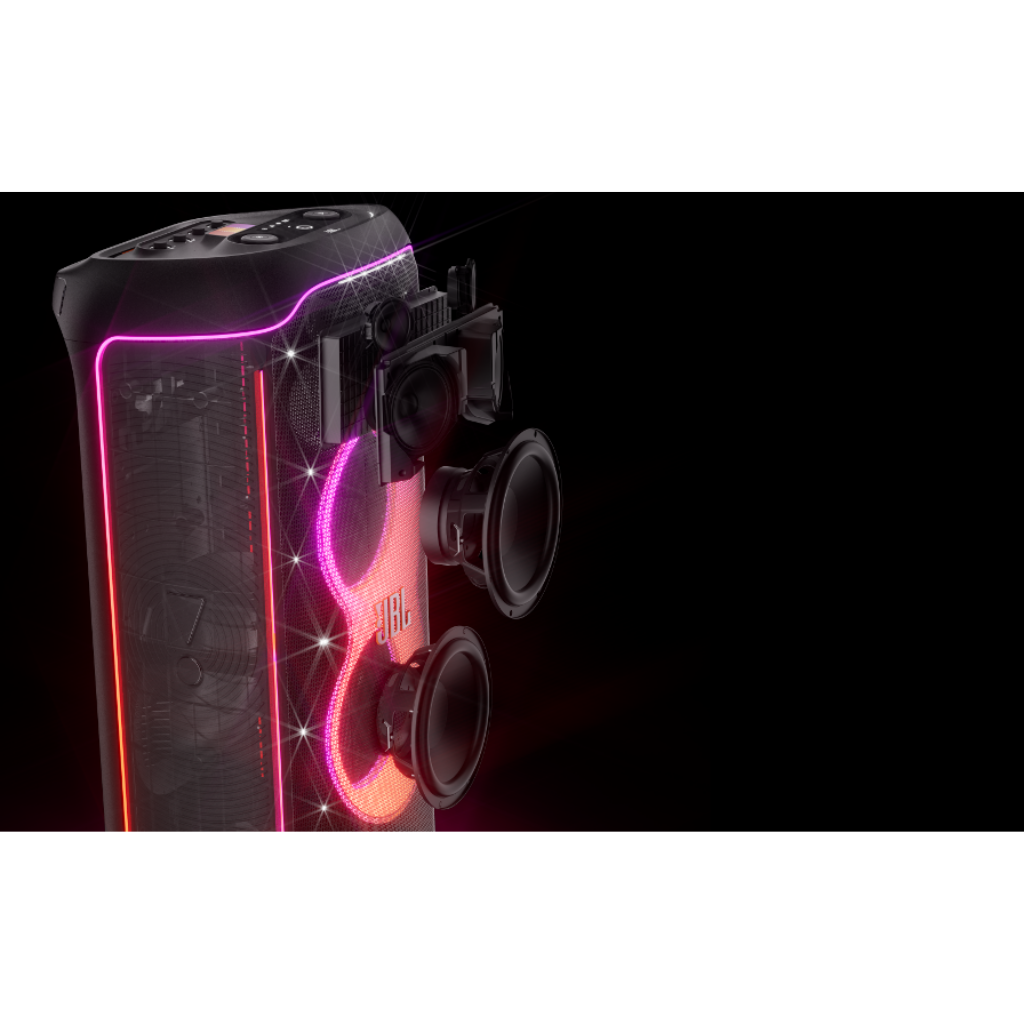 • 1100W RMS massive output with Original JBL Pro Sound. • Wi-Fi and Bluetooth connectivity with Dolby Atmos support (over Wi-Fi). • Multi-Dimensional Lightshow with starry night and strobe effects. • IPX4 Splashproof rating. • Self-Tuning feature optimizes sound to the environment. • **Warranty: 1 Year General Warranty.**