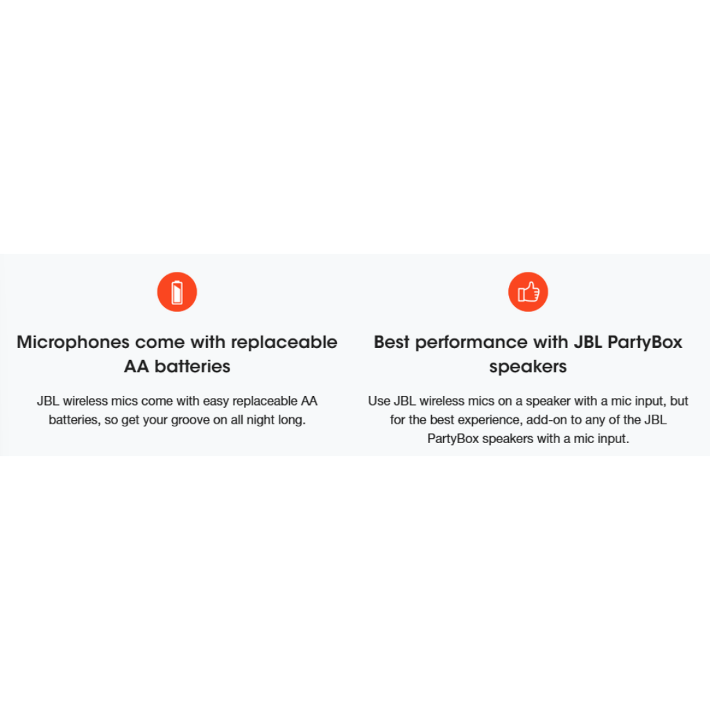 • High Vocal Quality with Original JBL Pro Sound clarity. • Rechargeable UHF Dual Channel Receiver for interference-free connection. • Plug and Play simplicity; connects directly to PartyBox speakers. • Microphones use replaceable AA Batteries. • 6 Hours Playtime on the receiver battery. • **Warranty: 1 Year General Warranty.**