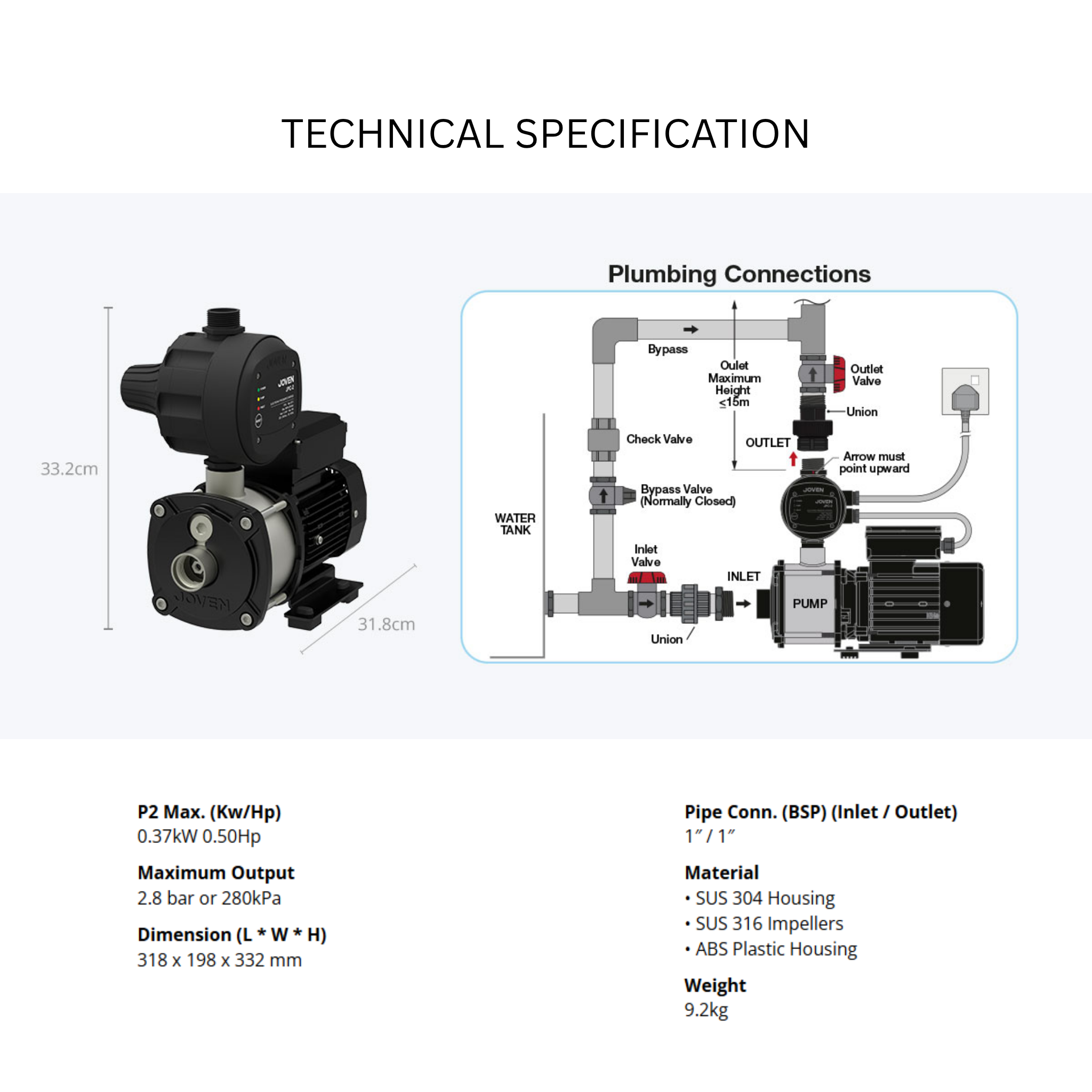 Boost your water pressure with the powerful Joven JHP 2-30. Features a 0.5HP motor, SUS316 stainless steel impellers, and silent operation. Perfect for 1-2 bathrooms.