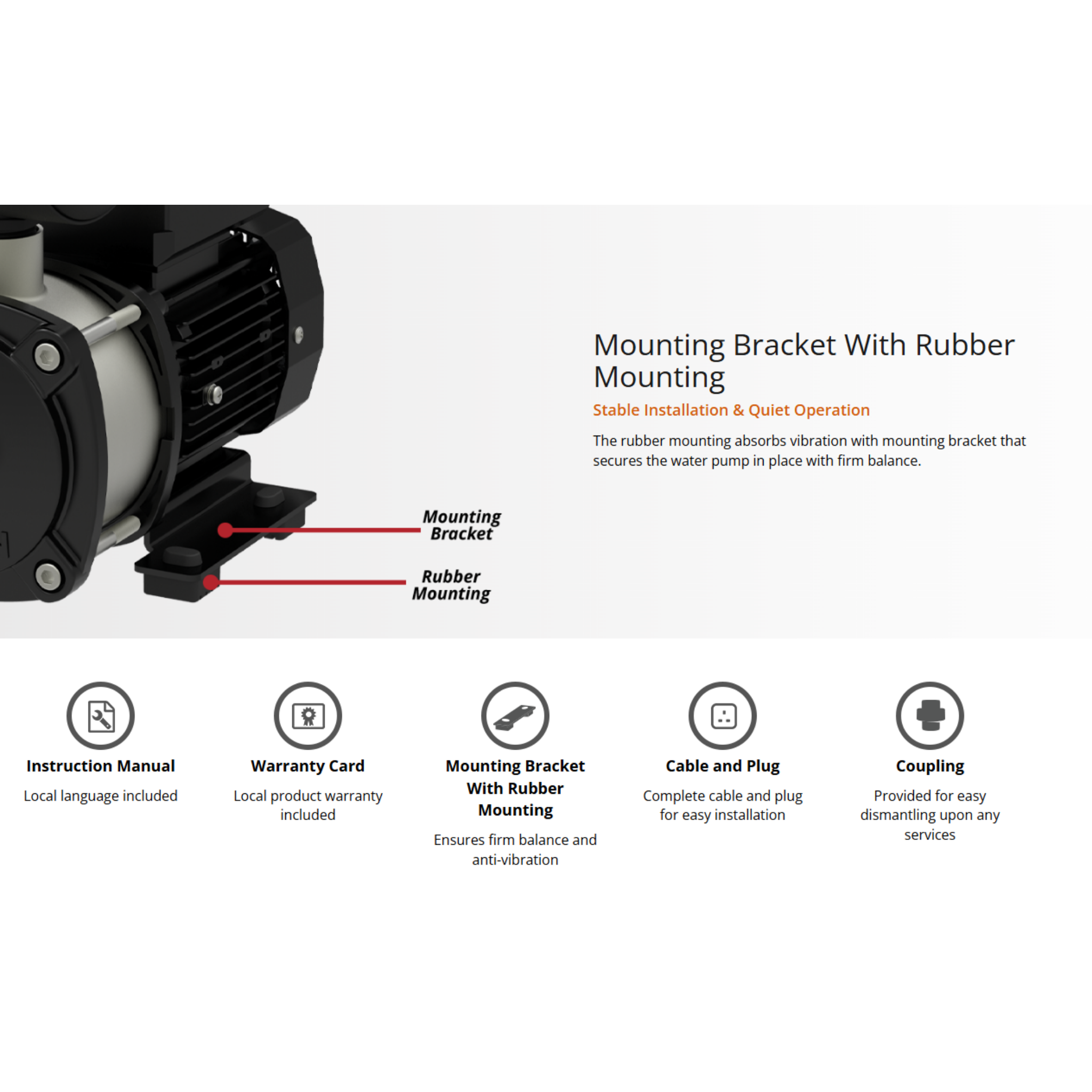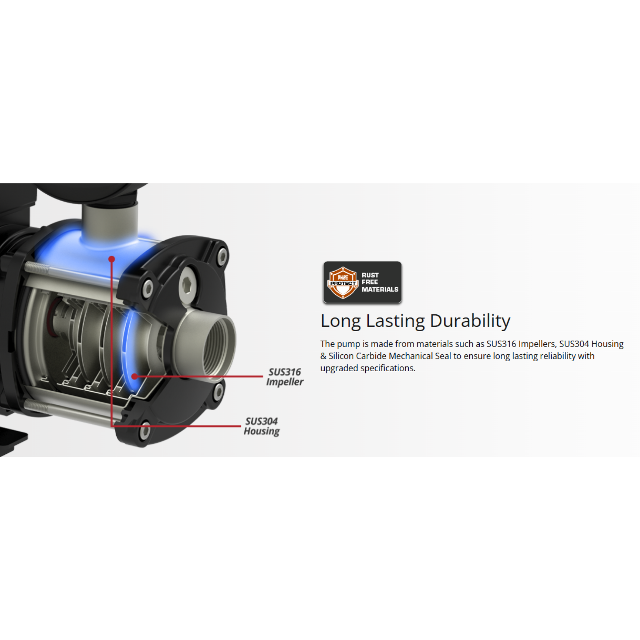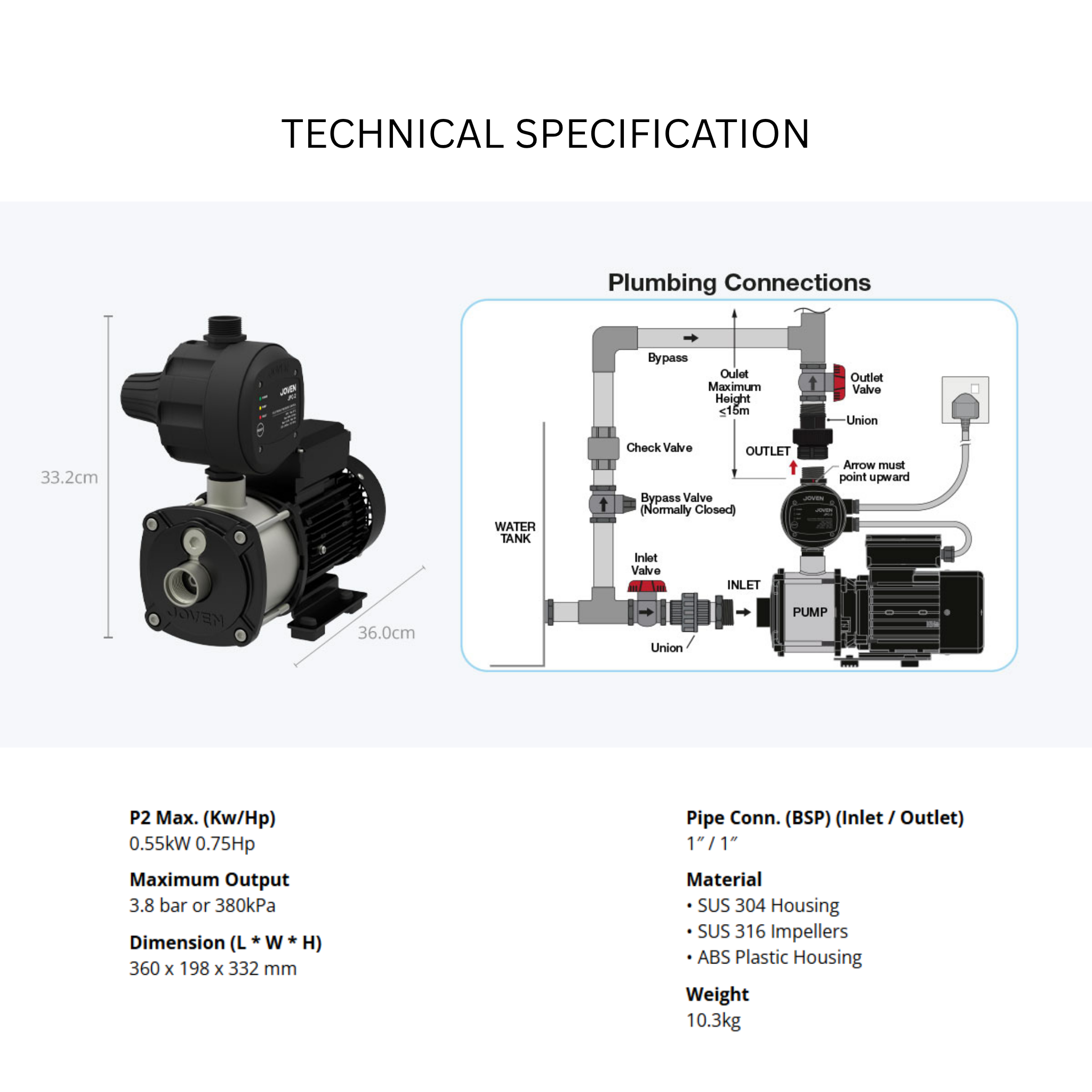 Enhance your home water pressure with the Joven JHP 3-40. Features a 0.75HP motor, SUS316 stainless steel impellers, and silent operation. Perfect for 2-3 bathrooms.