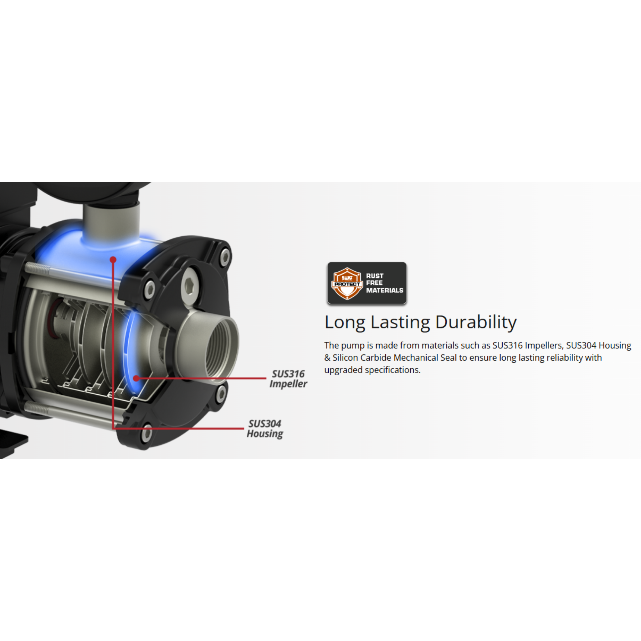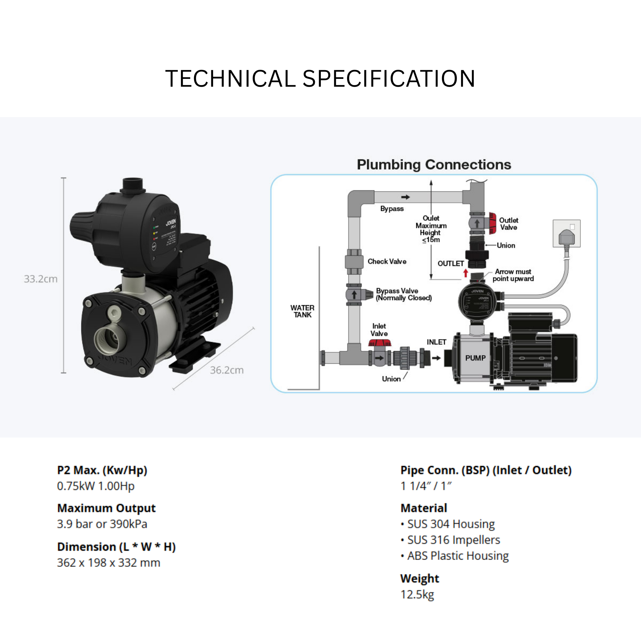 Boost your home’s water pressure with the Joven JHP 4-40. Features a powerful 1.0HP motor, SUS316 stainless steel impellers, and silent operation. Ideal for 3-4 bathrooms.