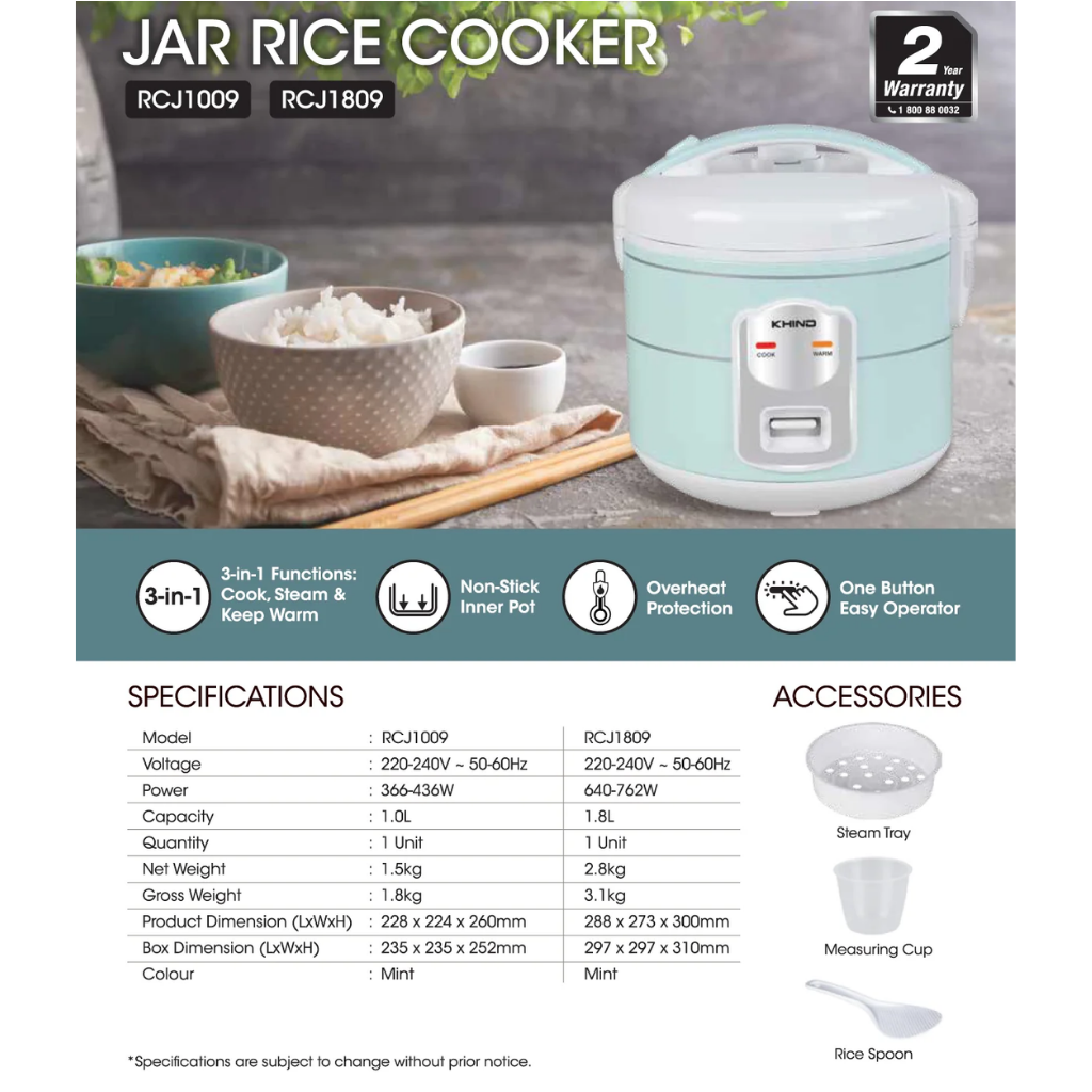KHIND 1.8L JAR RICE COOKER RCJ1809