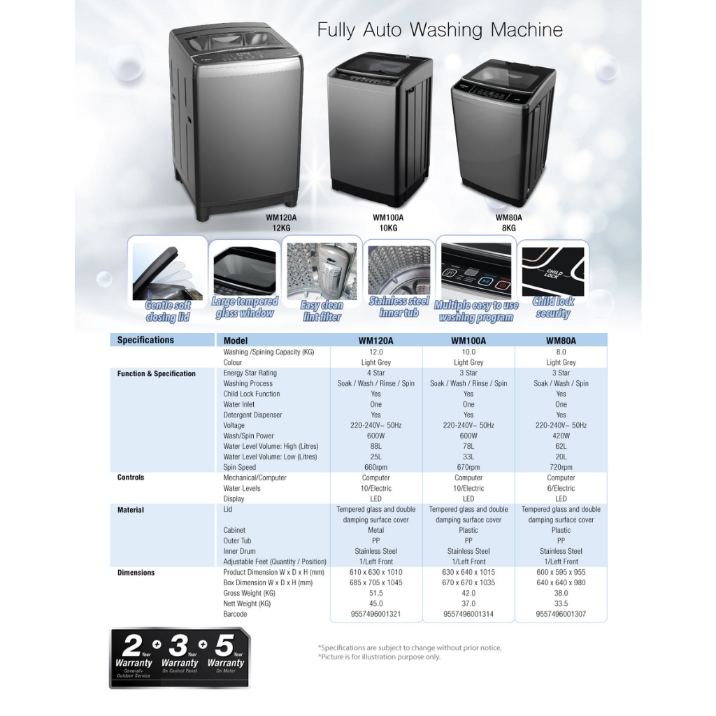 Features: • Fuzzy Logic Control • Child Safety Lock • Stainless Steel Inner Tub • Tempered Glass Lid • Power Failure Memory • Multiple Wash Programs • Warranty: 2 Years General, 3 Years Control Panel, 5 Years Motor Warranty