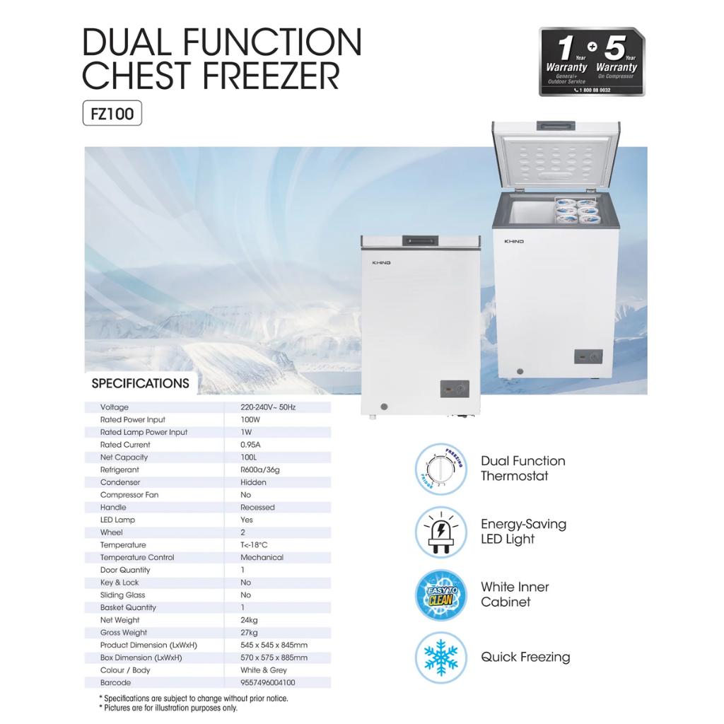 KHIND 100L CHEST FREEZER (WHITE) FZ100S
