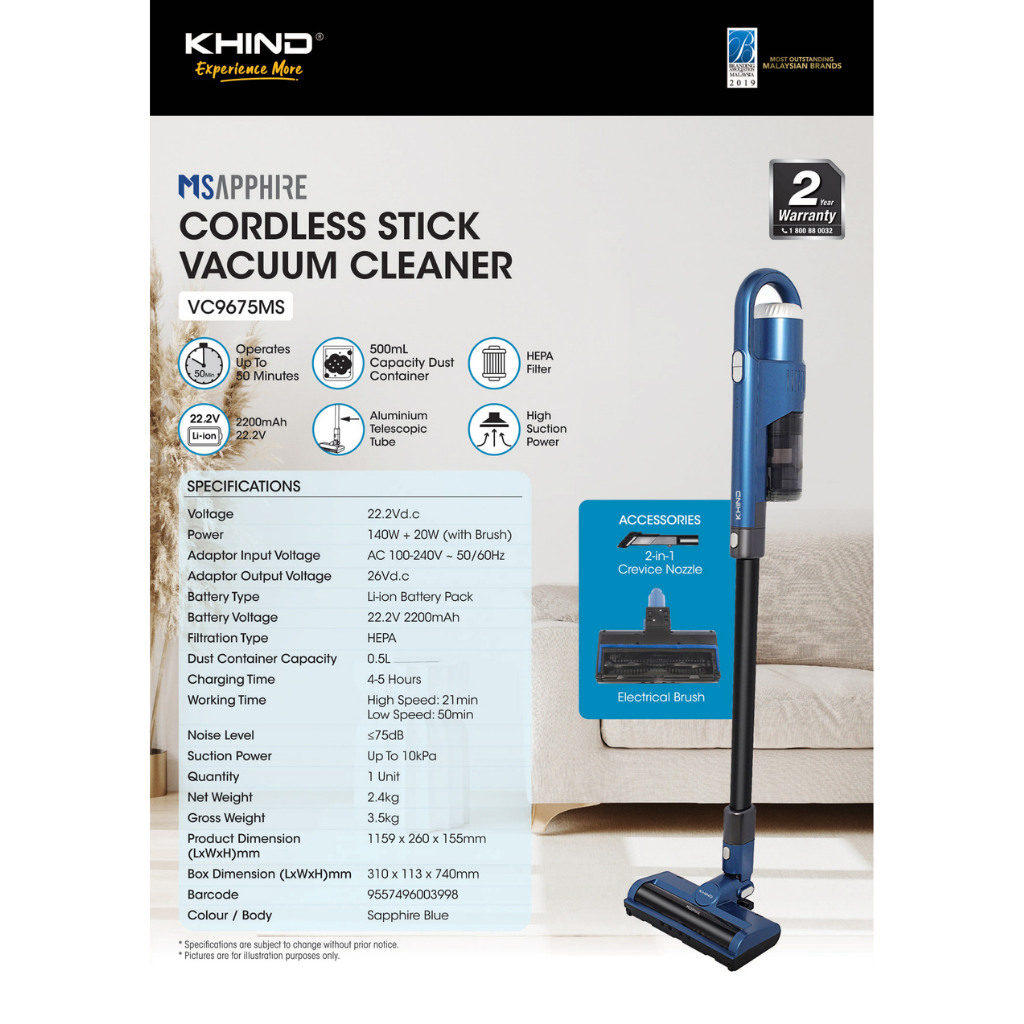 KHIND 140W + 20W (WITH BRUSH) CORDLESS STICK VA VC9675MS