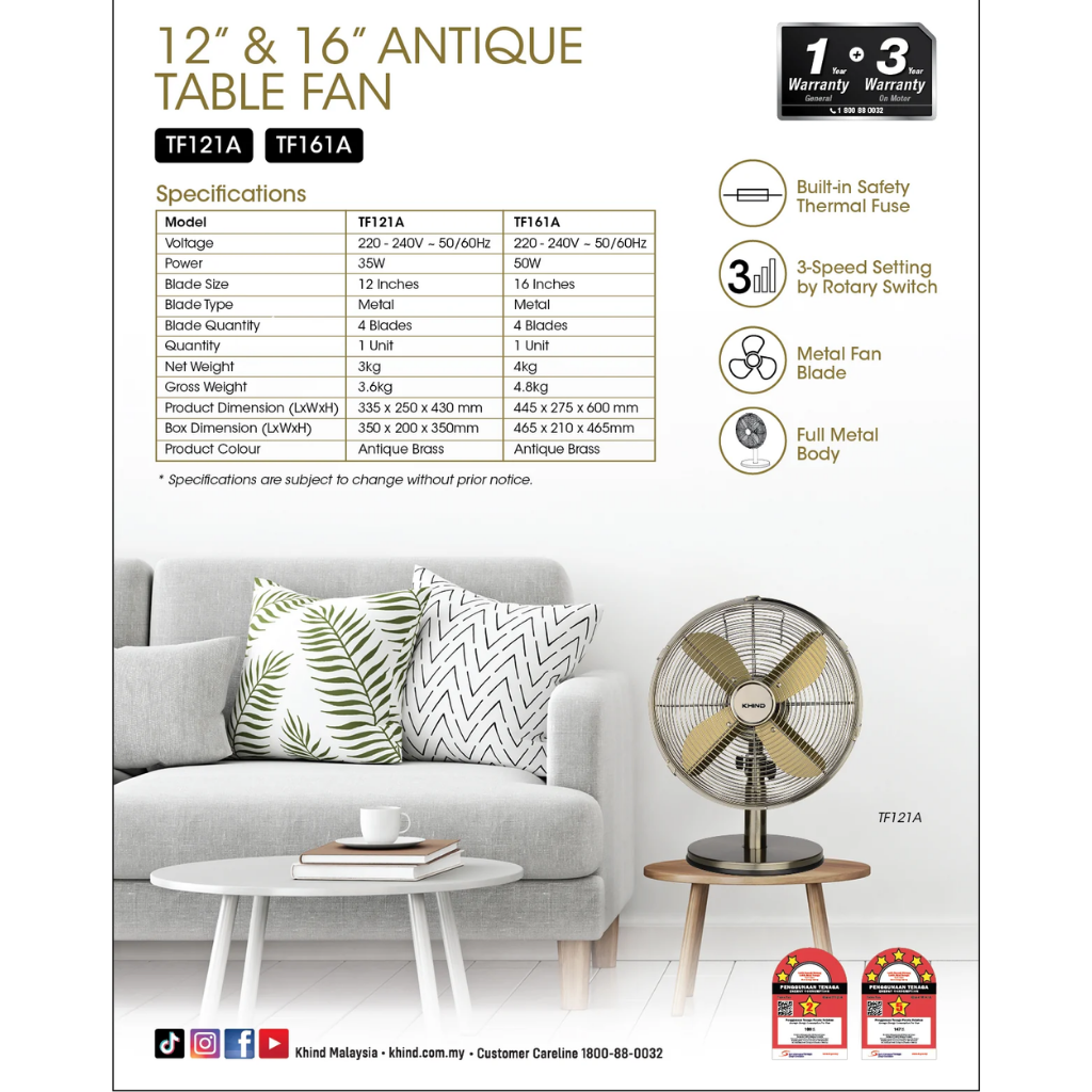 KHIND 16" ANTIQUE TABLE FAN TF161A