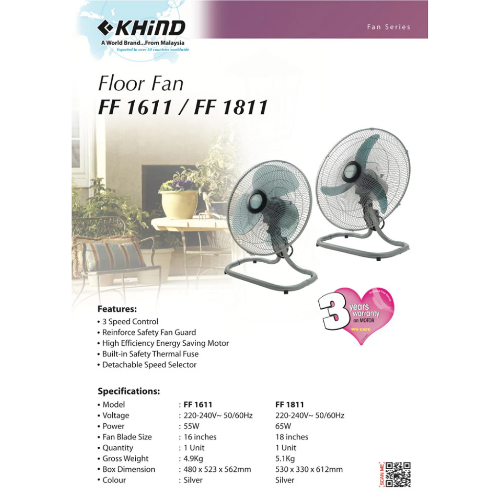 Features: • High Performance Motor • Built-in Safety Thermal Fuse • 3 Speed Push Button • Reinforced Safety Fan Guard • Oscillating Function • Warranty: 1 Year General, 3 Years Motor Warranty