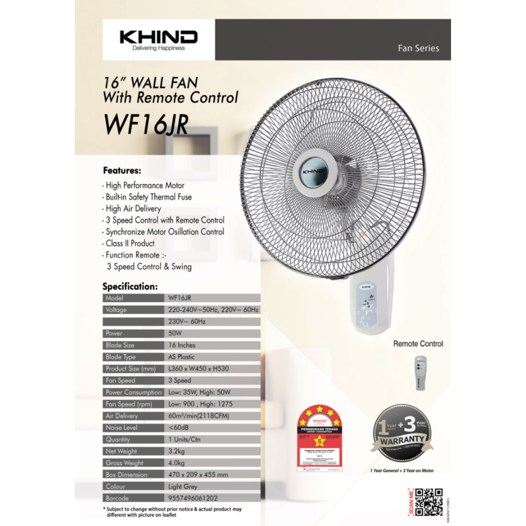 KHIND 16" REMOTE CONTROL WALL FAN WF-16JR