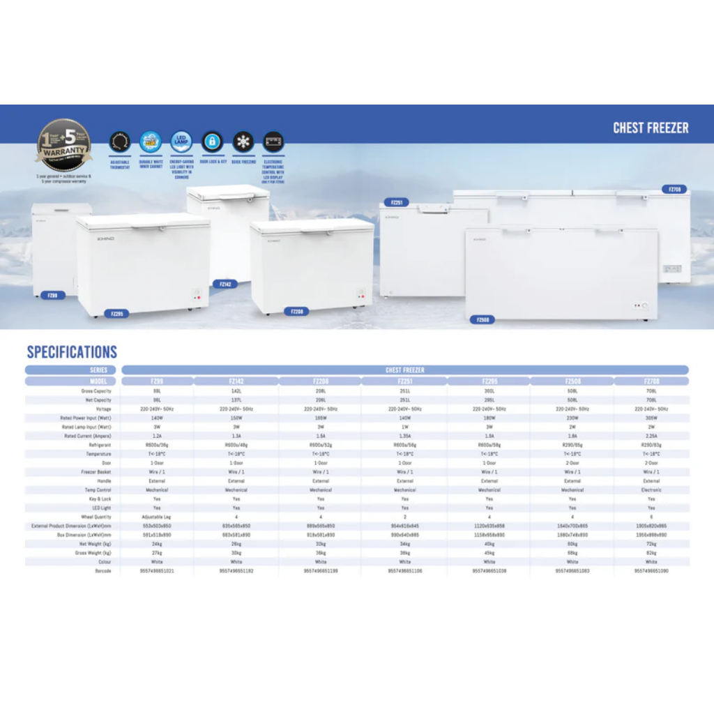 Features: • Adjustable Thermostat • Direct Cooling System • Removable Storage Basket • Built-in Safety Lock • Manual Defrost • Easy to Clean Inner Body • Warranty: 1 Year General Warranty, 5 Years Compressor Warranty