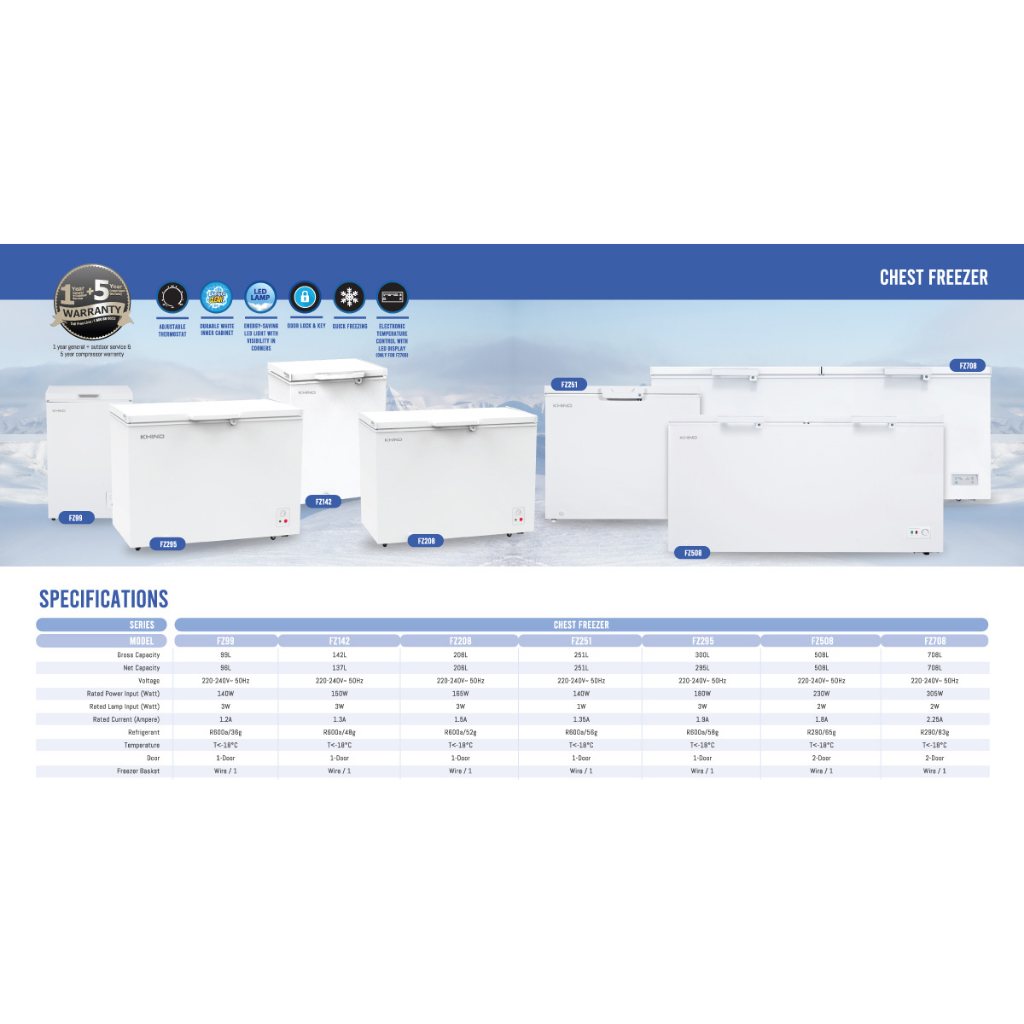 Features: • Adjustable Thermostat • Direct Cooling System • Removable Storage Basket • Built-in Safety Lock • Manual Defrost • Easy to Clean Inner Body • Warranty: 1 Year General Warranty, 5 Years Compressor Warranty