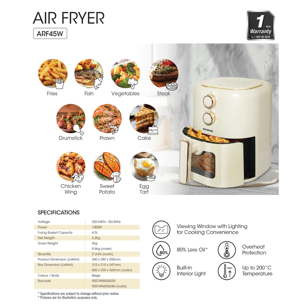 Khind® Air Fryer With Window Viewing 4.5L 1400W ARF45W