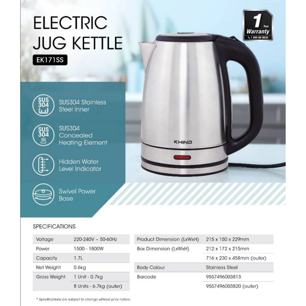 Khind 1.7L Electric Jug Kettle 1500W~1800W EK171SS
