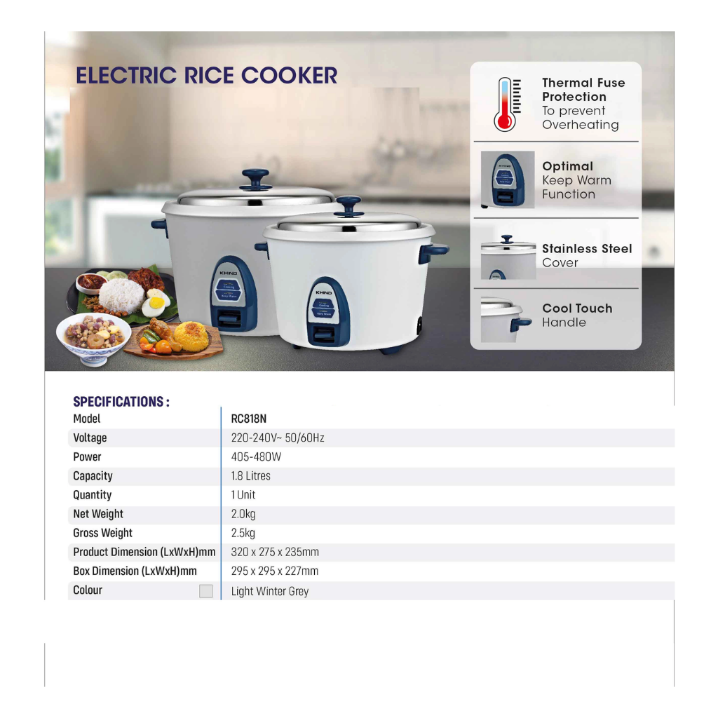 Khind 1.8L ELECTRIC RICE COOKER 405W~480W RC818N