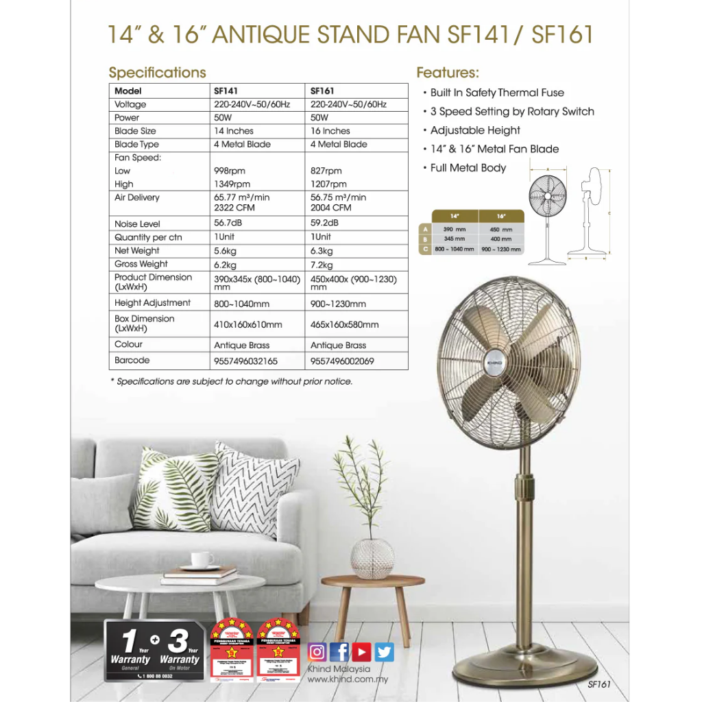 Khind 14" ANTIQUE STAND FAN with 4 METAL BLADE SF141
