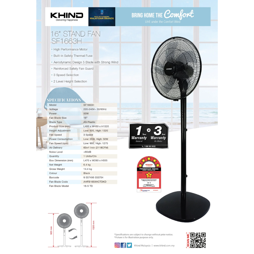 Features: • High Performance Motor • Built-in Safety Thermal Fuse • 3 Speed Push Button • Reinforced Safety Fan Guard • Oscillating Function • Warranty: 1 Year General Warranty, 3 Years Motor Warranty