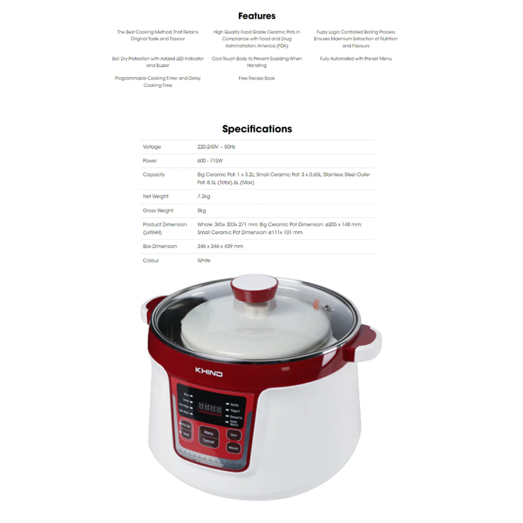 Features: • Ceramic Pots • Preset Cooking Menus • Boil Dry Protection • Timer Control • Nutrient Preservation • Warranty: 1 Year General Warranty