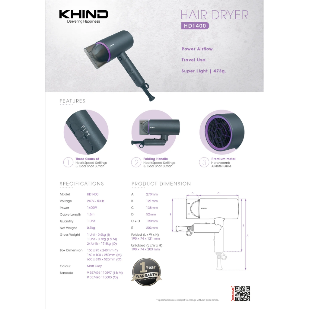 Khind Foldable Handle Hair Dryer 1400W HD1400