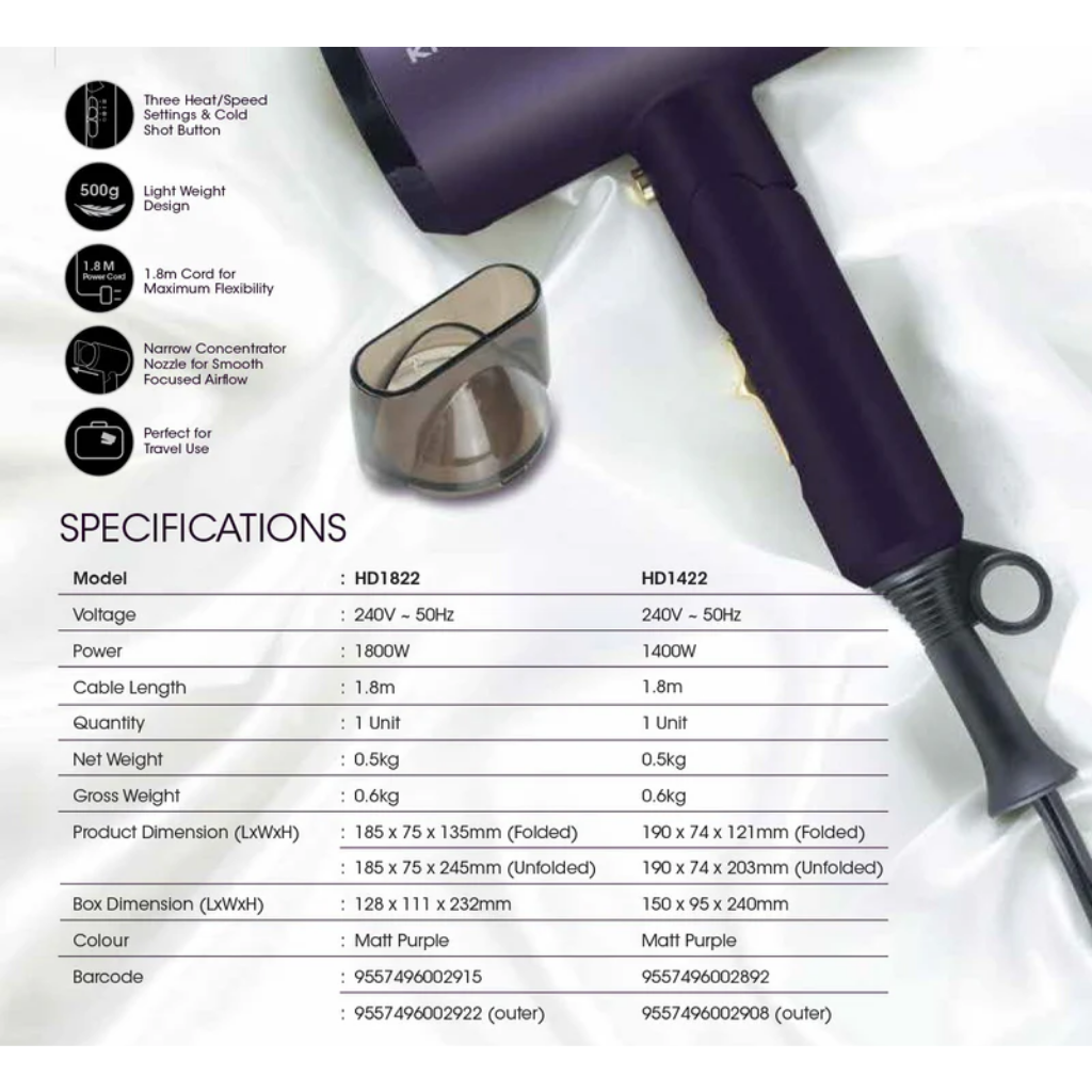 Khind Foldable Handle Hair Dryer With Ionizer 1400W HD1422