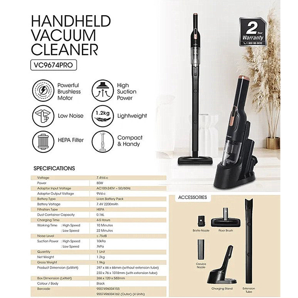Khind Handheld Vacuum Cleaner With Bldc Motor 90W 7.4V D.C VC9674PRO