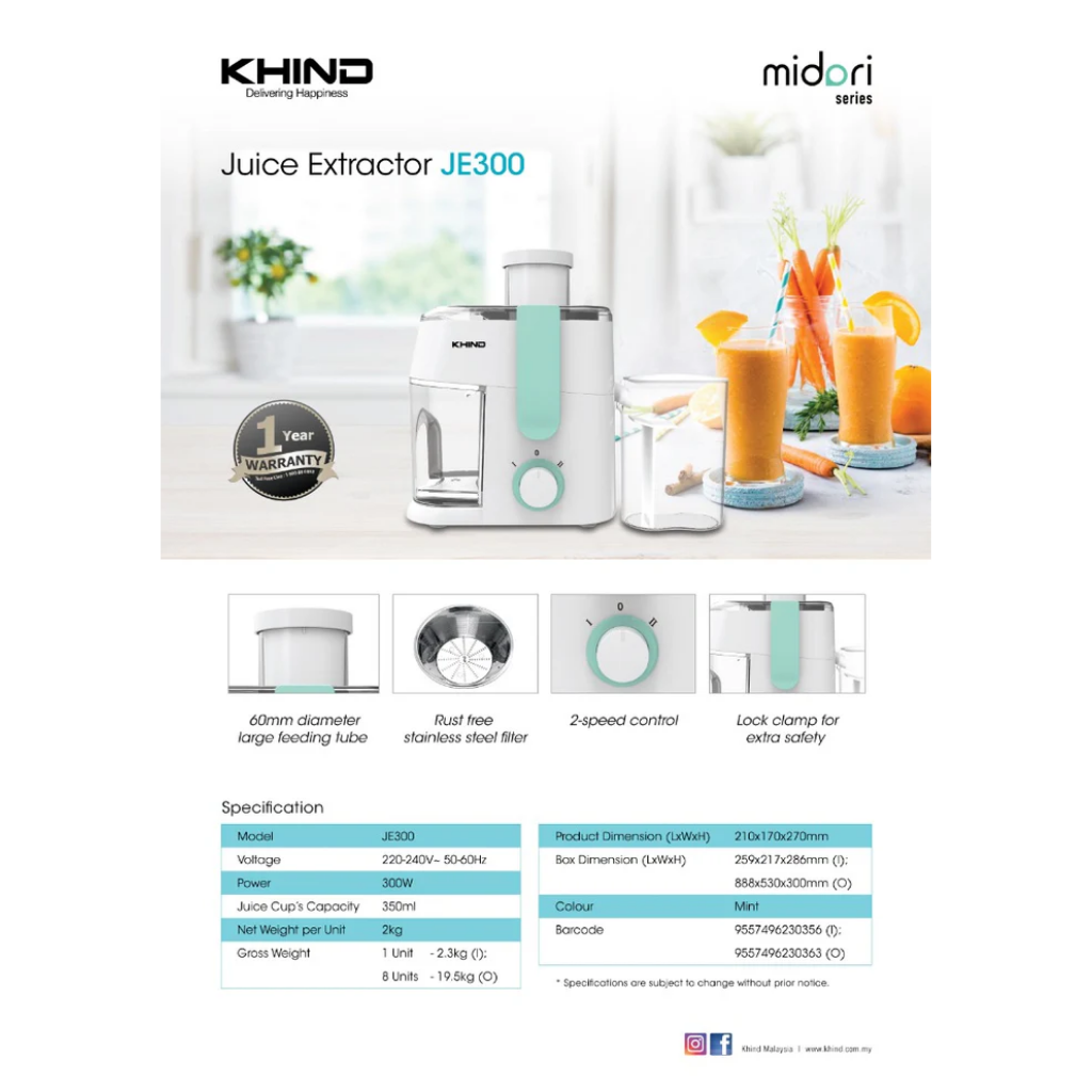 Khind Juice Extractor With 350Ml Cup 300W JE300