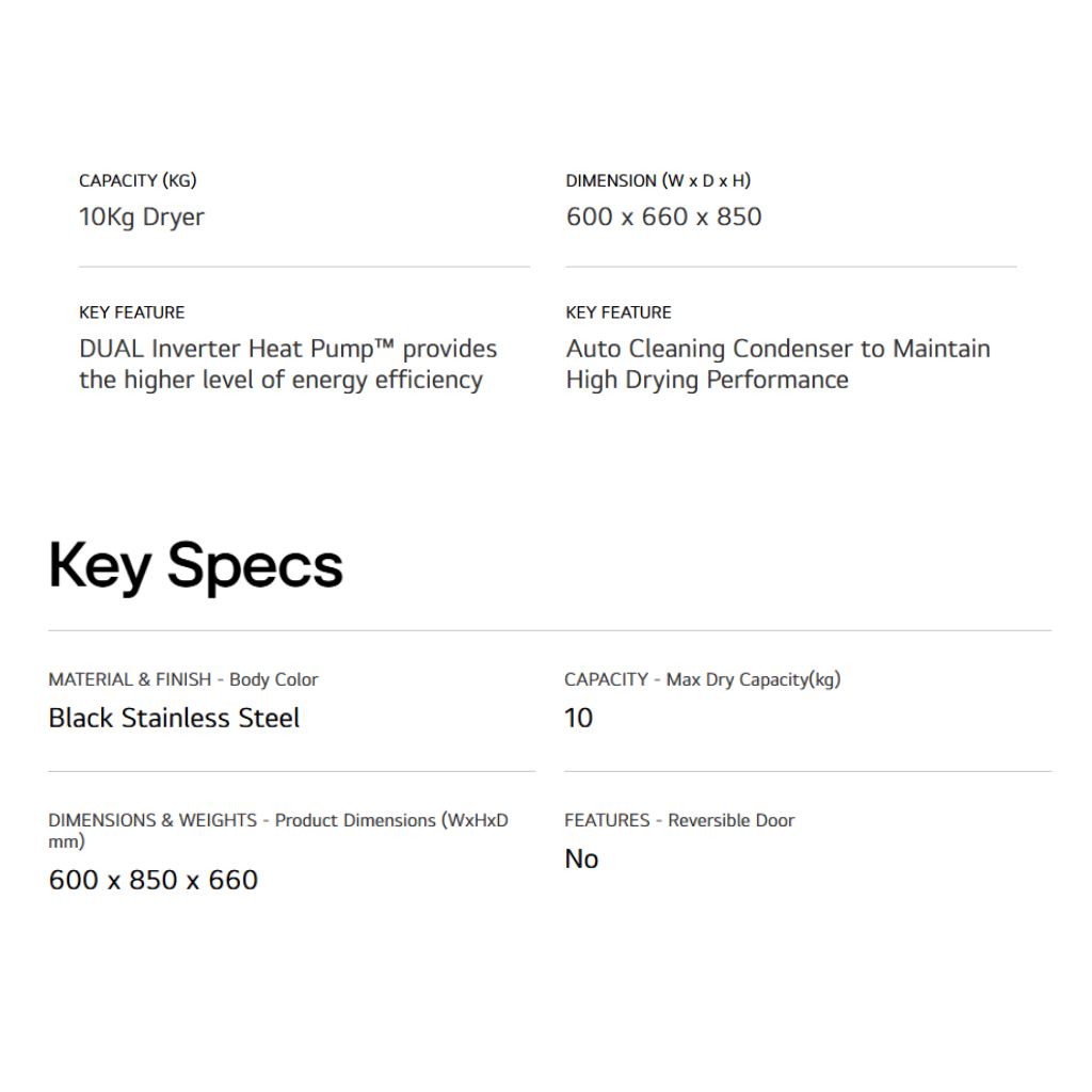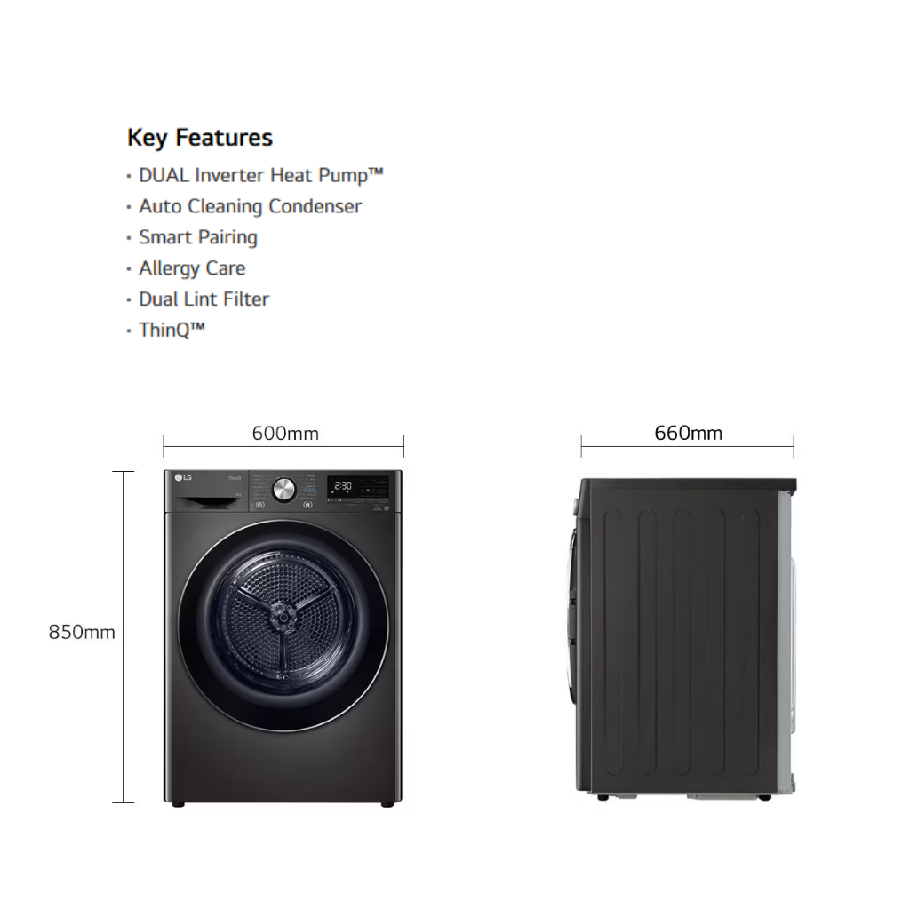 • 10kg Capacity Heat Pump Dryer. • Dual Inverter Heat Pump™ for maximum energy efficiency. • Allergy Care kills 99.9% of live dust mites. • Auto Cleaning Condenser maintains performance. • Eco Hybrid™ technology (Energy vs Time mode). • **Warranty: 1 Year General Warranty, 10 Years Motor Warranty.**