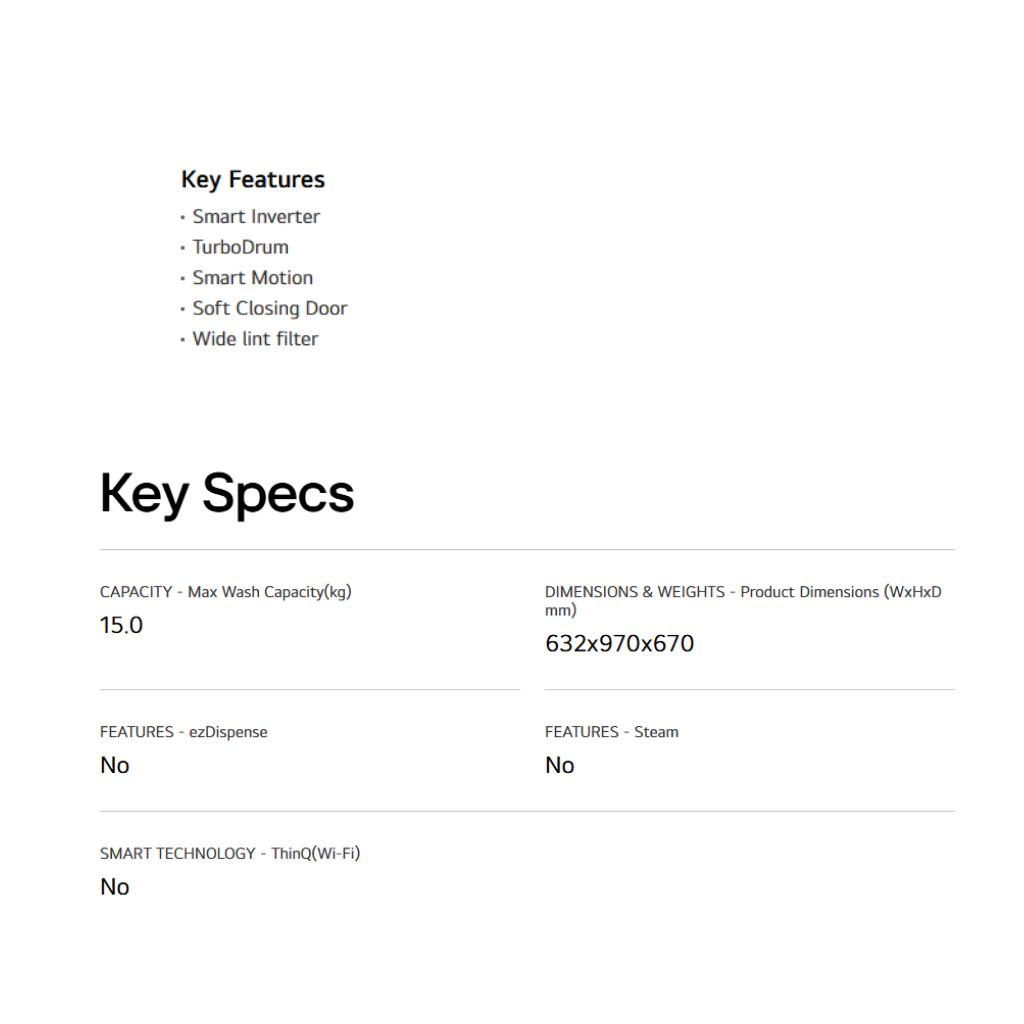 • 15kg Capacity. • Smart Inverter Technology. • TurboDrum™ effectively removes dirt. • Smart Motion for customized washing. • Tub Clean function. • Soft Closing Door. • **Warranty: 1 Year General Warranty, 10 Years Motor Warranty.**