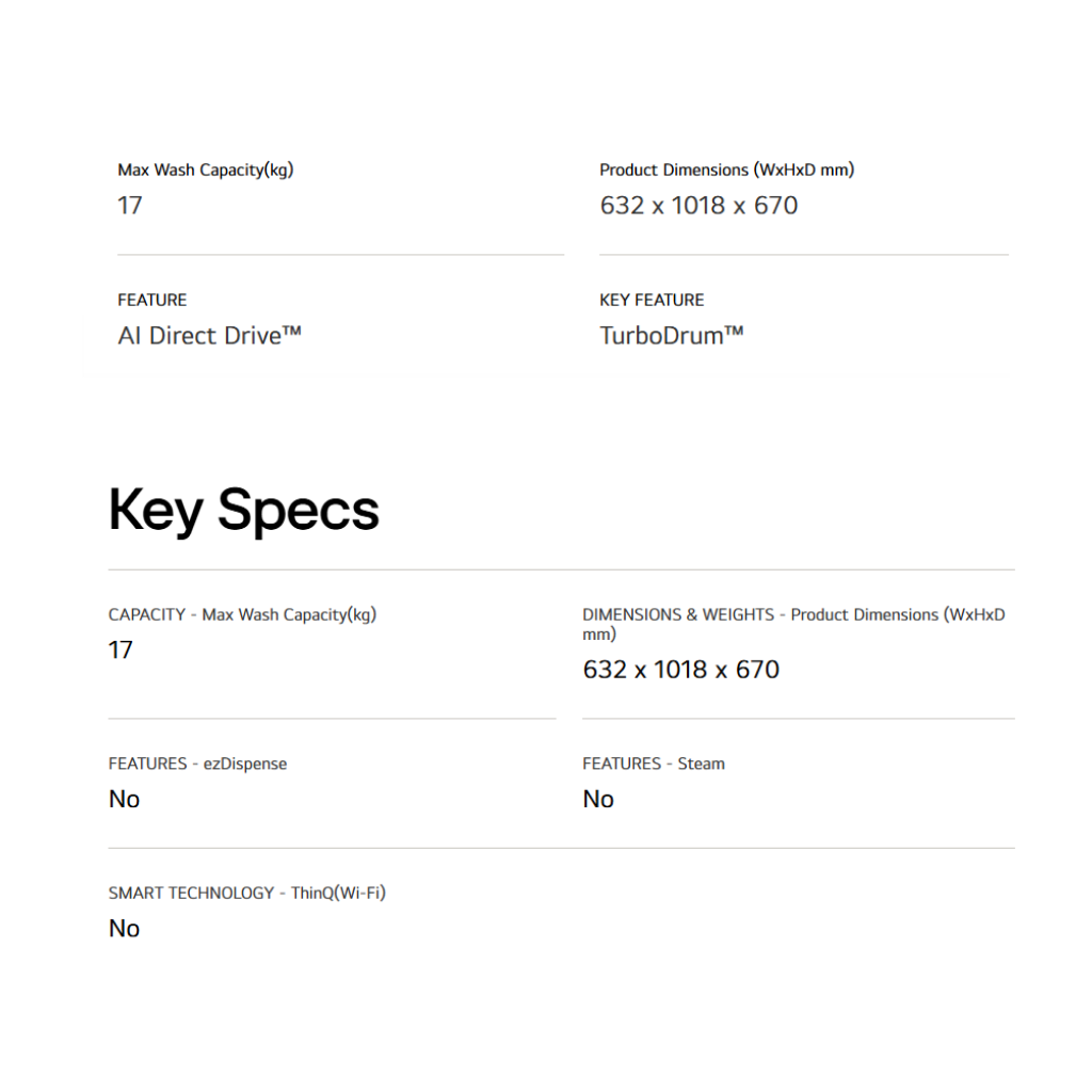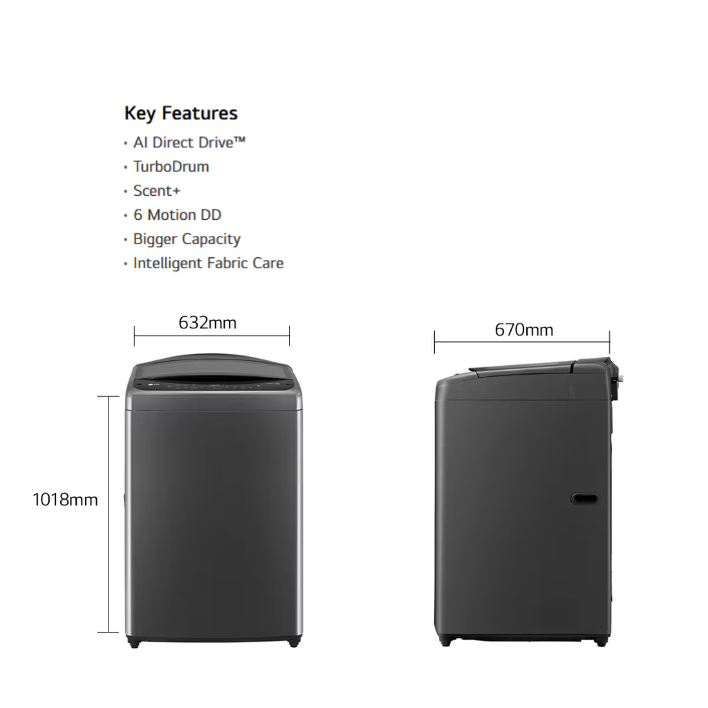• 17kg Large Capacity. • AI Direct Drive™ motor. • TurboWash™ saves time and energy. • Steam™ function for hygiene. • Full Stainless Steel Tub. • ThinQ™ Wi-Fi enabled. • **Warranty: 1 Year General Warranty, 10 Years Motor Warranty.**