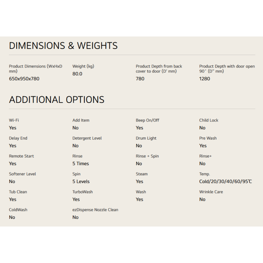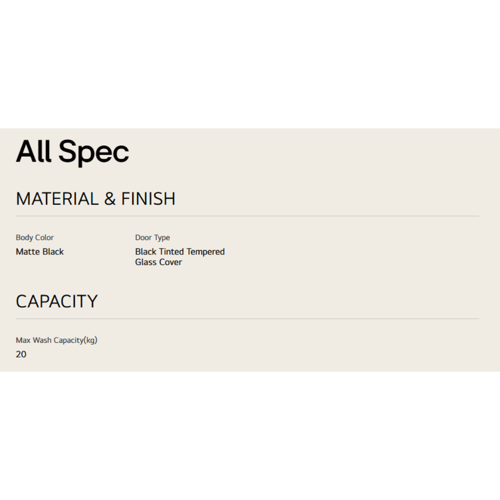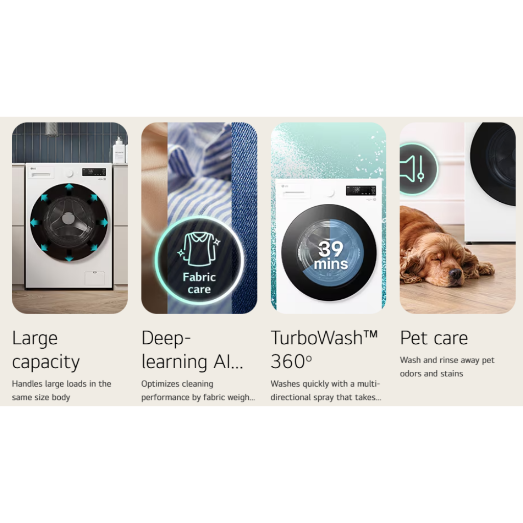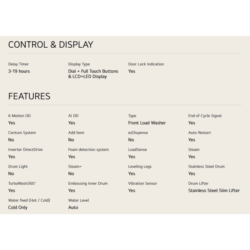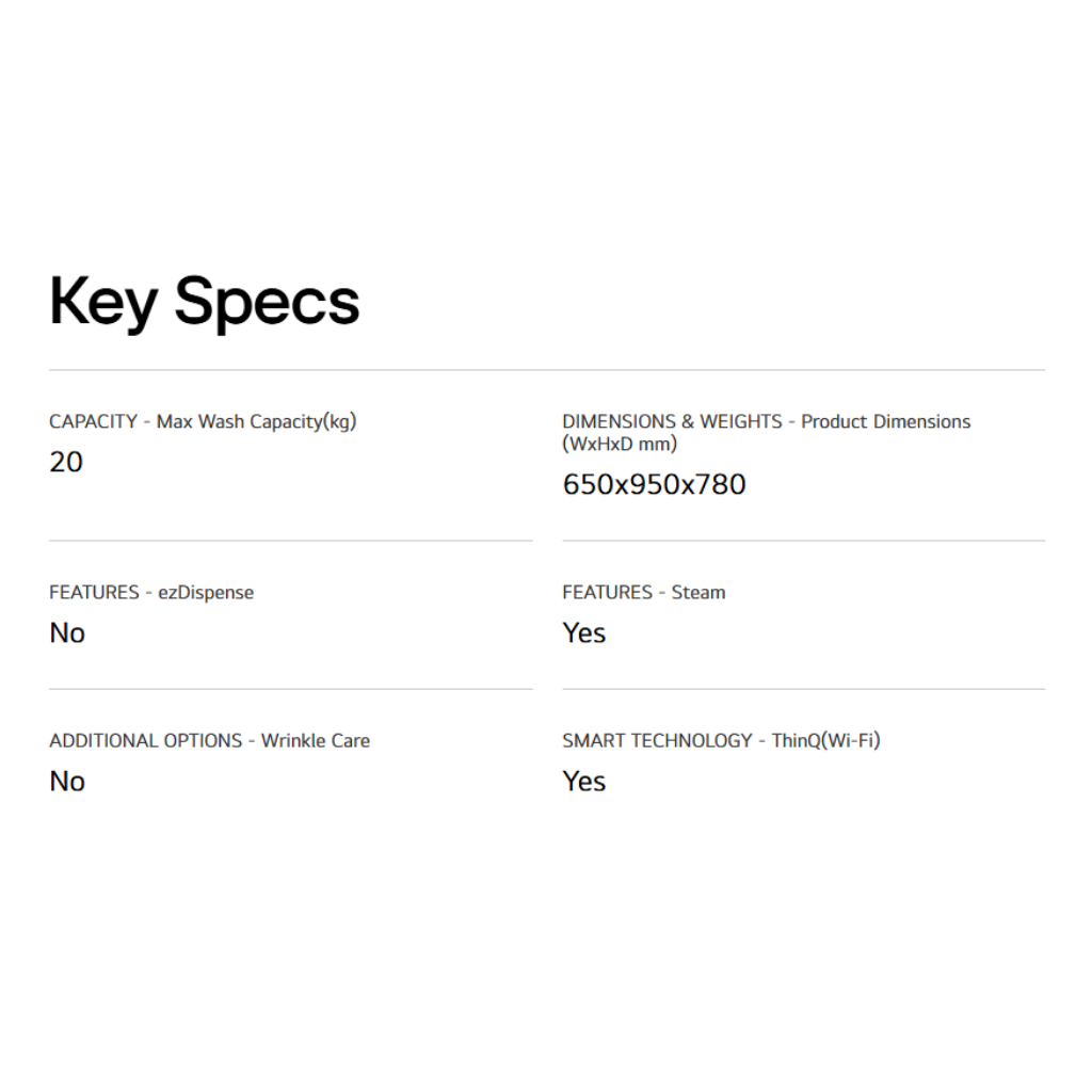 • 20kg Mega Capacity cleans king-size duvets easily. • AI Direct Drive™ intelligence for fabric care. • TurboWash™ technology for faster washing. • 6 Motion DD washing capability. • ThinQ™ App compatibility for remote control. • Steam™ hygiene function. • **Warranty: 1 Year General Warranty, 10 Years Motor Warranty.**